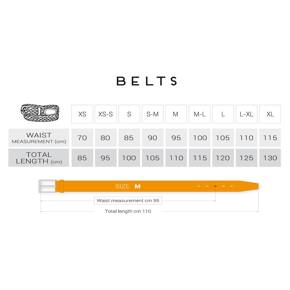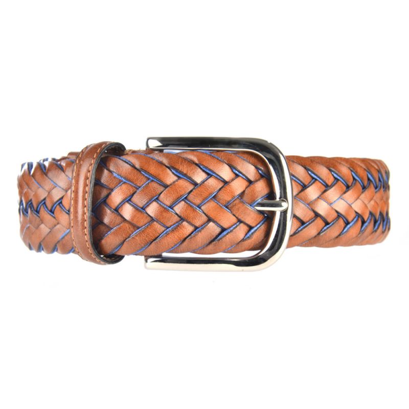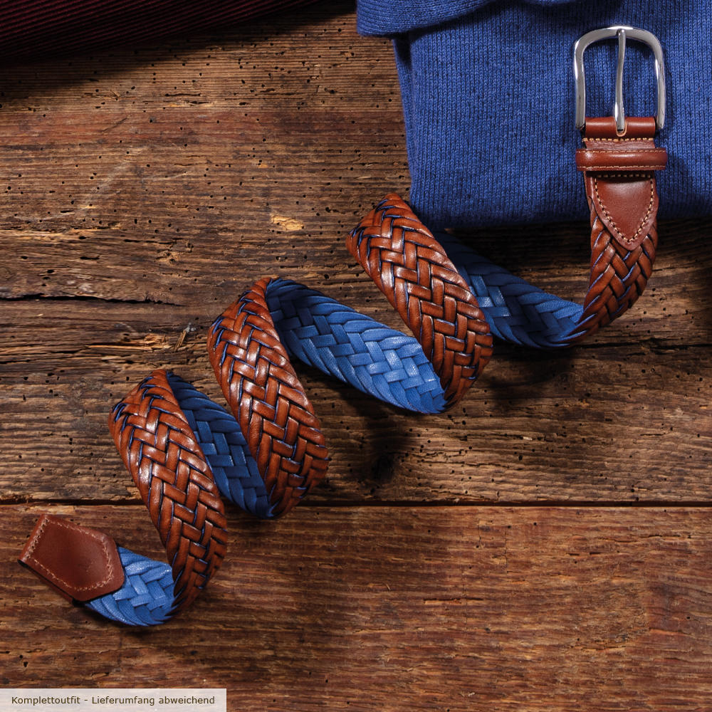 Geflochtener elastischer Gürtel aus elf Ledersträngen und elf gewachsten Baumwollgarnen. Spitze und Schlaufe aus edlem, pflanzlich gegerbtem Leder. Ohne Löcher. Hergestellt in Italien.