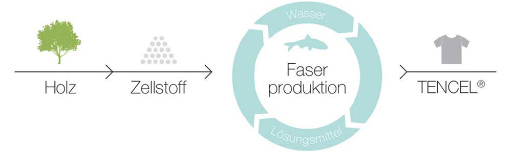 Cellulosische Fasern wie Viskose und Lyocell entstehen hauptsächlich aus Holz, indem zuerst die enthaltenen Harze und Wachse aus dem Holz gelöst werden. Danach wird in einem komplexen Verfahren eine Masse hergestellt, die durch Düsen gepresst wird. Die entstandenen Fasern werden gereinigt und gebleicht, bevor sie für die Produktion von Textilien verwendet werden. Die LENZING AG aus Österreich hat ein wesentlich umweltschonenderes Produktionsverfahren entwickelt, bei dem der Wasserverbrauch deutlich geringer als bei der Herstellung von konventioneller Baumwolle ist. Deren Umweltauswirkungen sind vergleichbar mit denen, die bei der Herstellung von Bio Baumwolle entstehen.