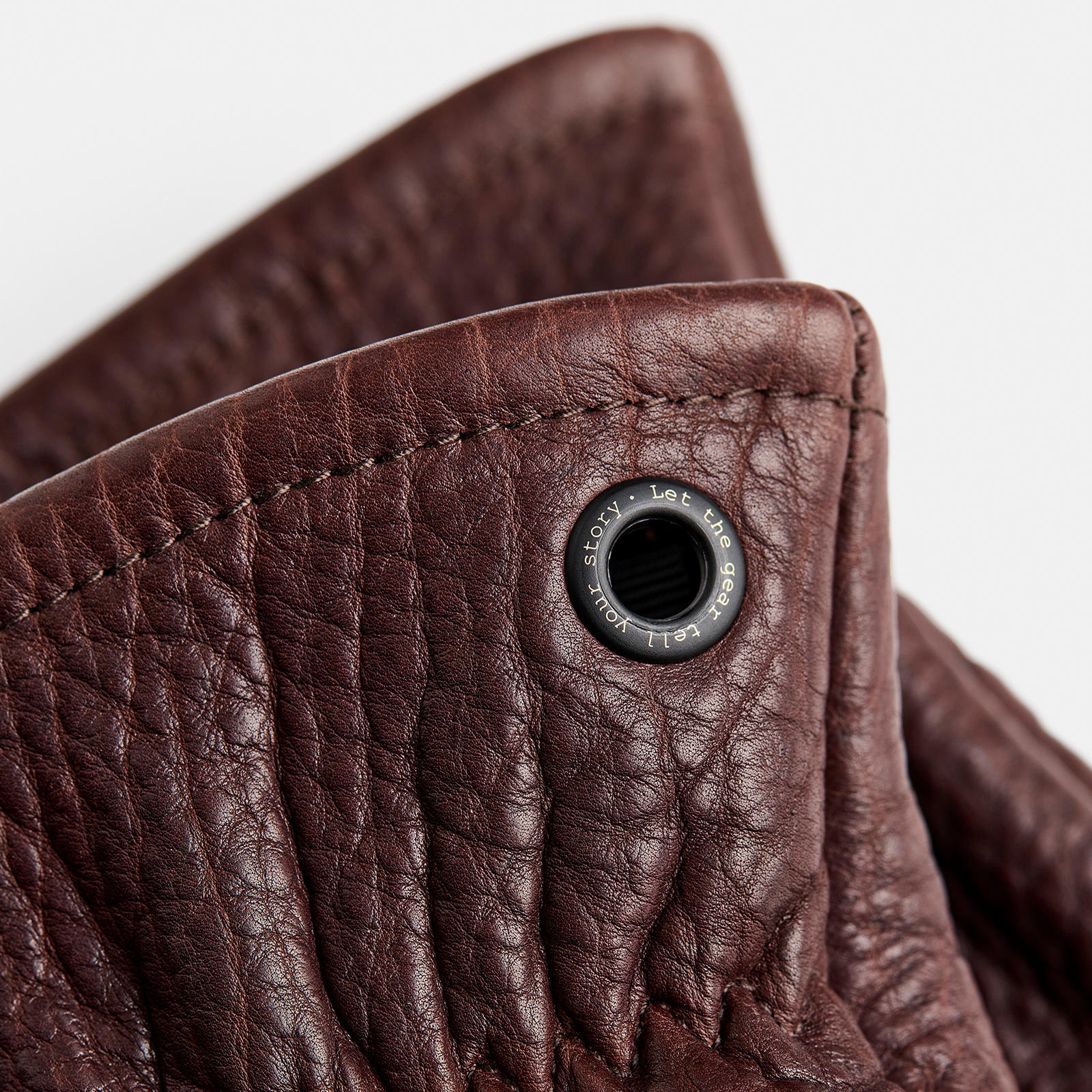 Der saumlange Schaft schützt nicht nur die Hände, sondern auch die Handgelenke vor scharfen Ästen, Funkenflug und rauem Unterholz. Eine stabile Messingöse in Schwarz ermöglicht das einfache Befestigen am Gürtel oder Rucksack — so bleiben die Handschuhe stets griffbereit.