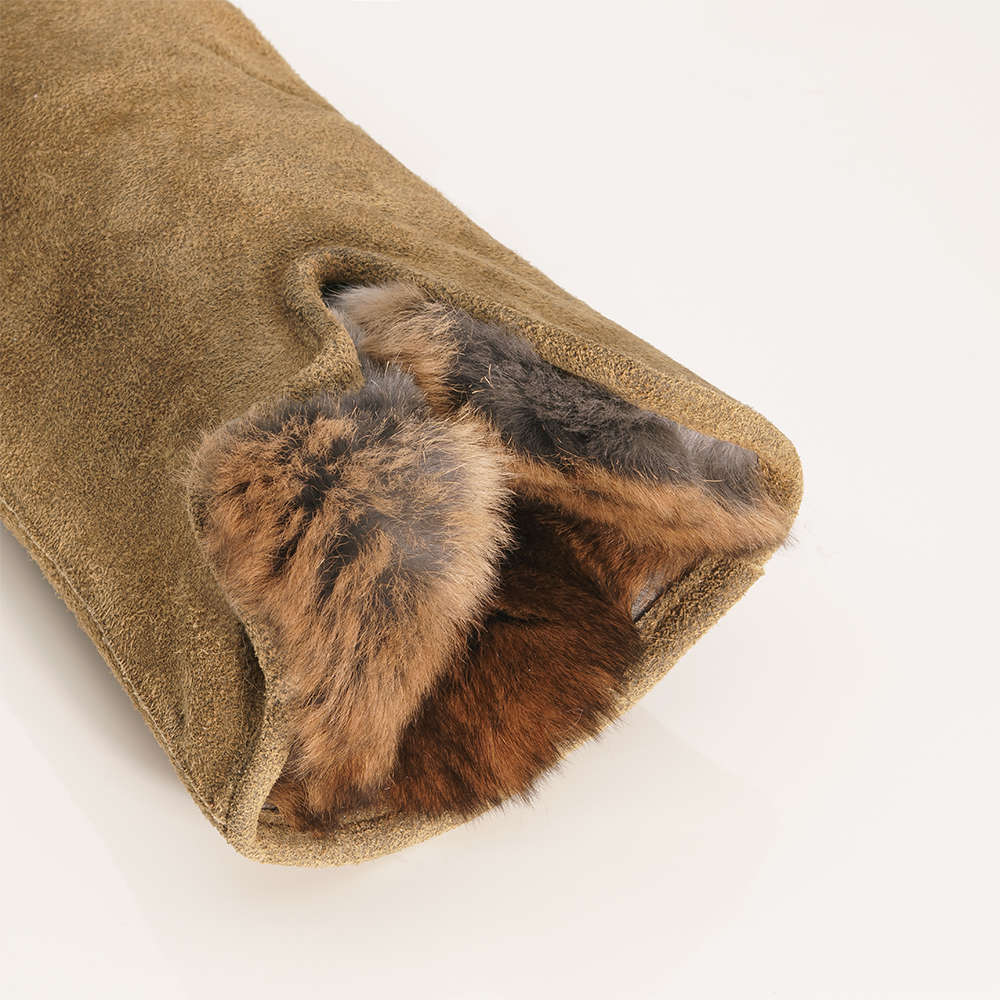 Das hochwertige Veloursleder, in Kombination mit feinstem französischem Samt-Kaninchenfell prägt die edle und erlesene Ästhetik des Damenhandschuhs GELA. Der klassisch elegante Schnitt mit Schlitz am Handrücken macht den Handschuh zu einem stilvollen Begleiter. Das weiche Kaschmirinnenfutter sorgt für angenehm warme Hände und hohen Tragekomfort. Die Umschlagstulpe kann über das Handgelenk geschlagen werden und so für zusätzliche Wärme an kalten Wintertagen sorgen. Hochwertige Materialien und feinste Verarbeitung per Hand machen diesen luxuriösen Handschuh zu einem »Must-have« für lange Spaziergänge und verleihen Ihrem Outfit eine individuelle Note.