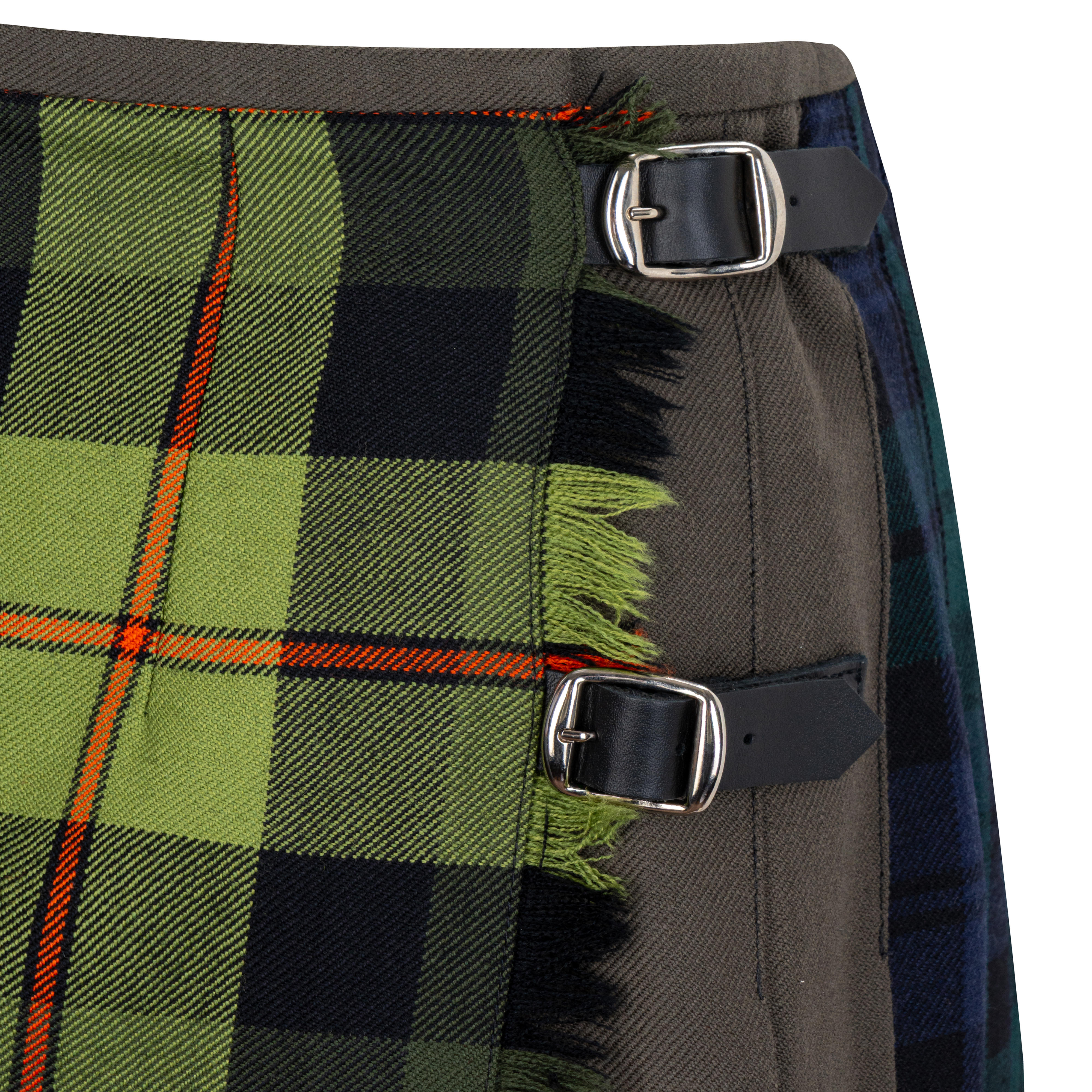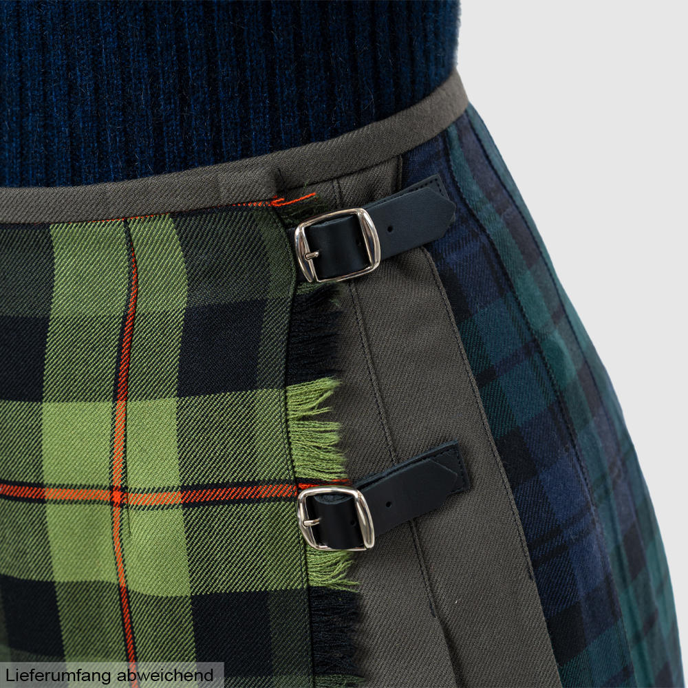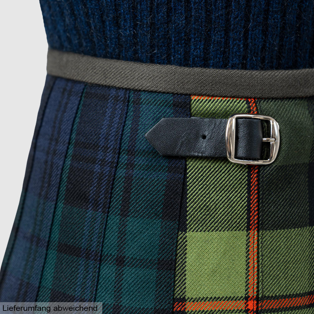 Der Rock wird traditionell in Dublin von Hand aus reiner Schurwolle gefertigt. Das hochwertige Gewebe zeichnet sich durch eine angenehm weiche Haptik, exzellente Formstabilität und natürliche Wärme aus. Typische Kiltdetails wie drei markante Lederschnallen in Kontrastfarbe unterstreichen die Taille und ermöglichen eine flexible, passgenaue Regulierung. Eine elegante Kiltnadel fasst die weich schwingenden Stoffbahnen zusammen und rundet das klassische Erscheinungsbild gekonnt ab.