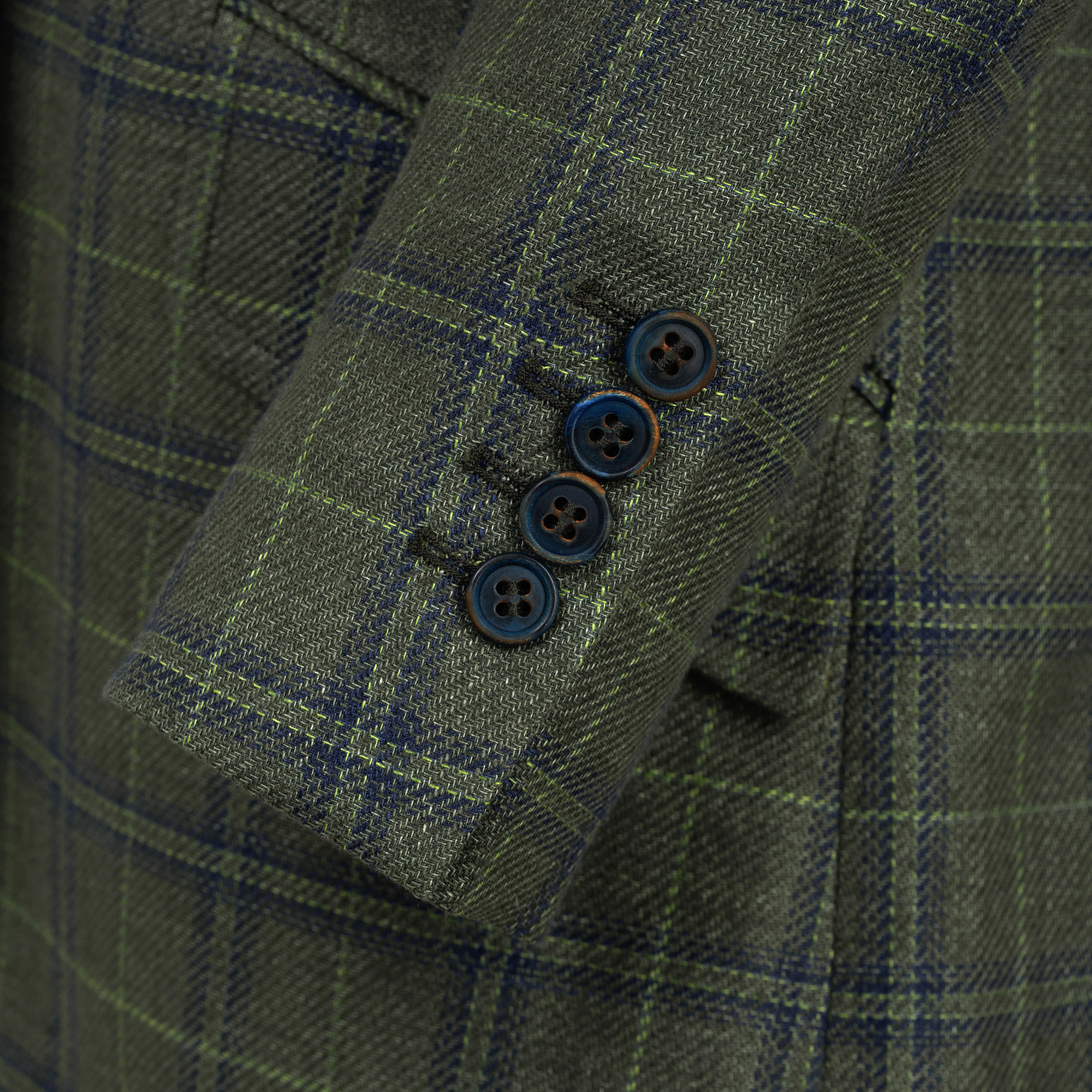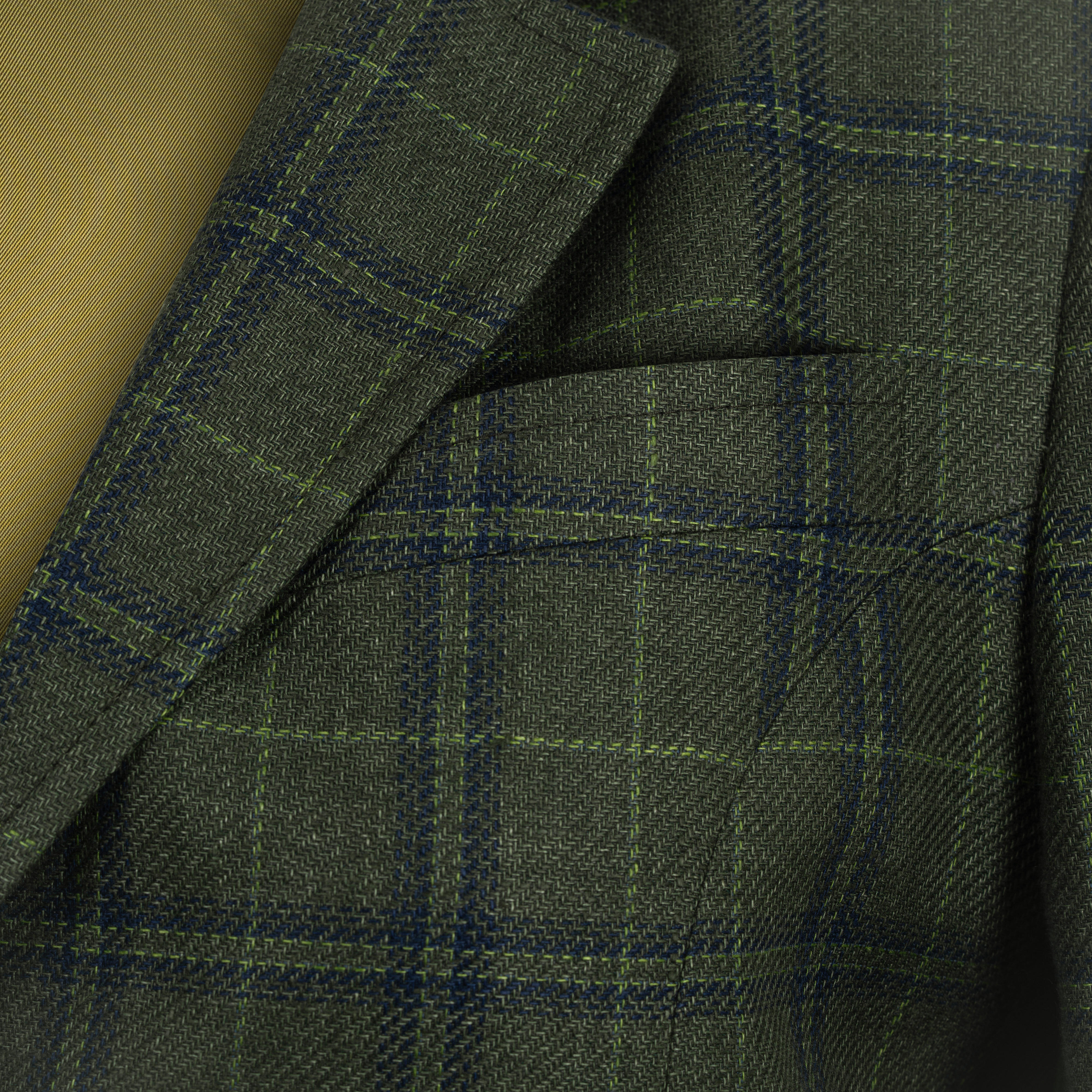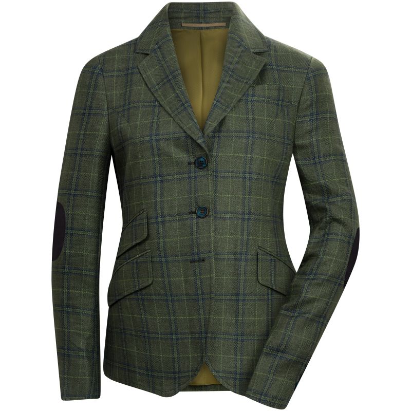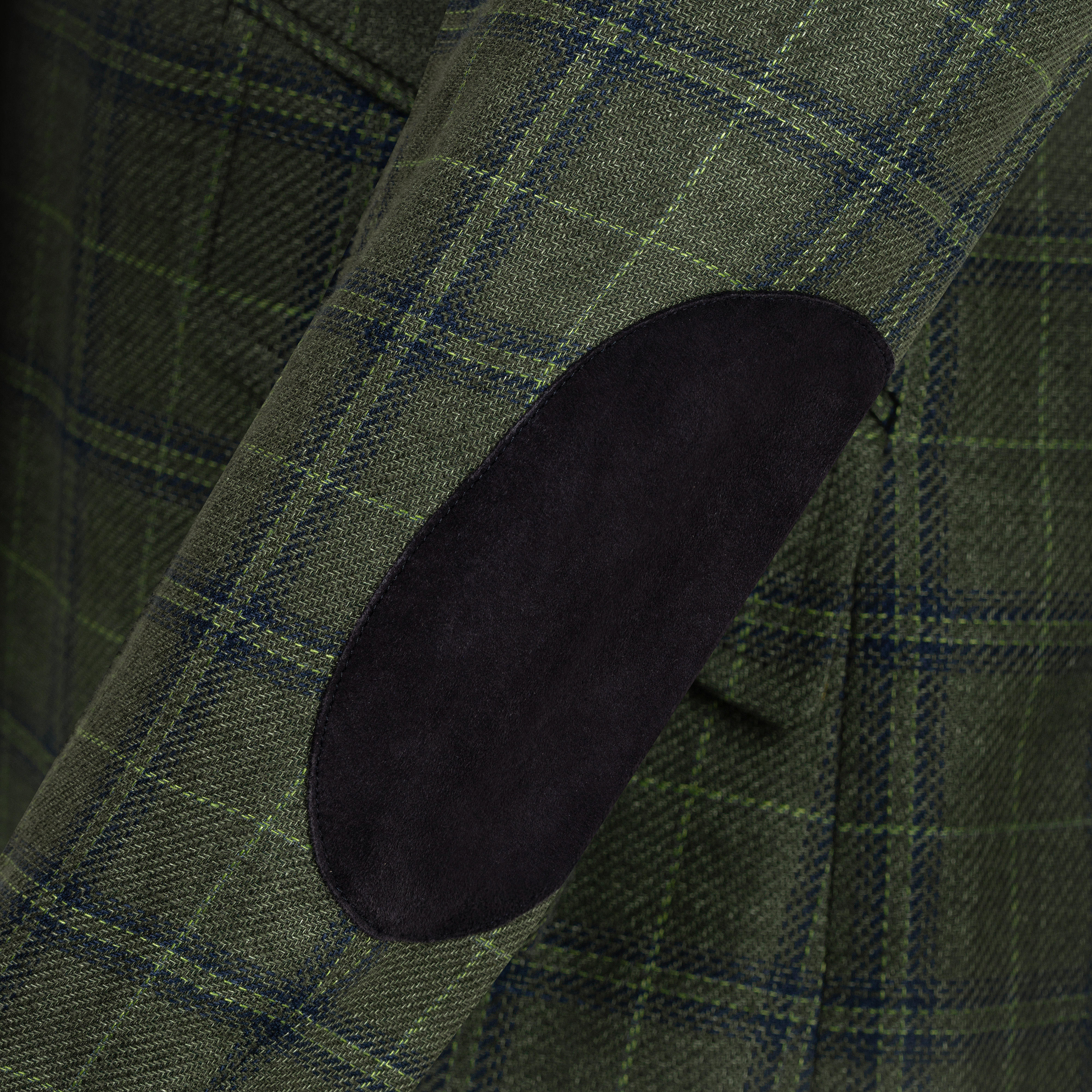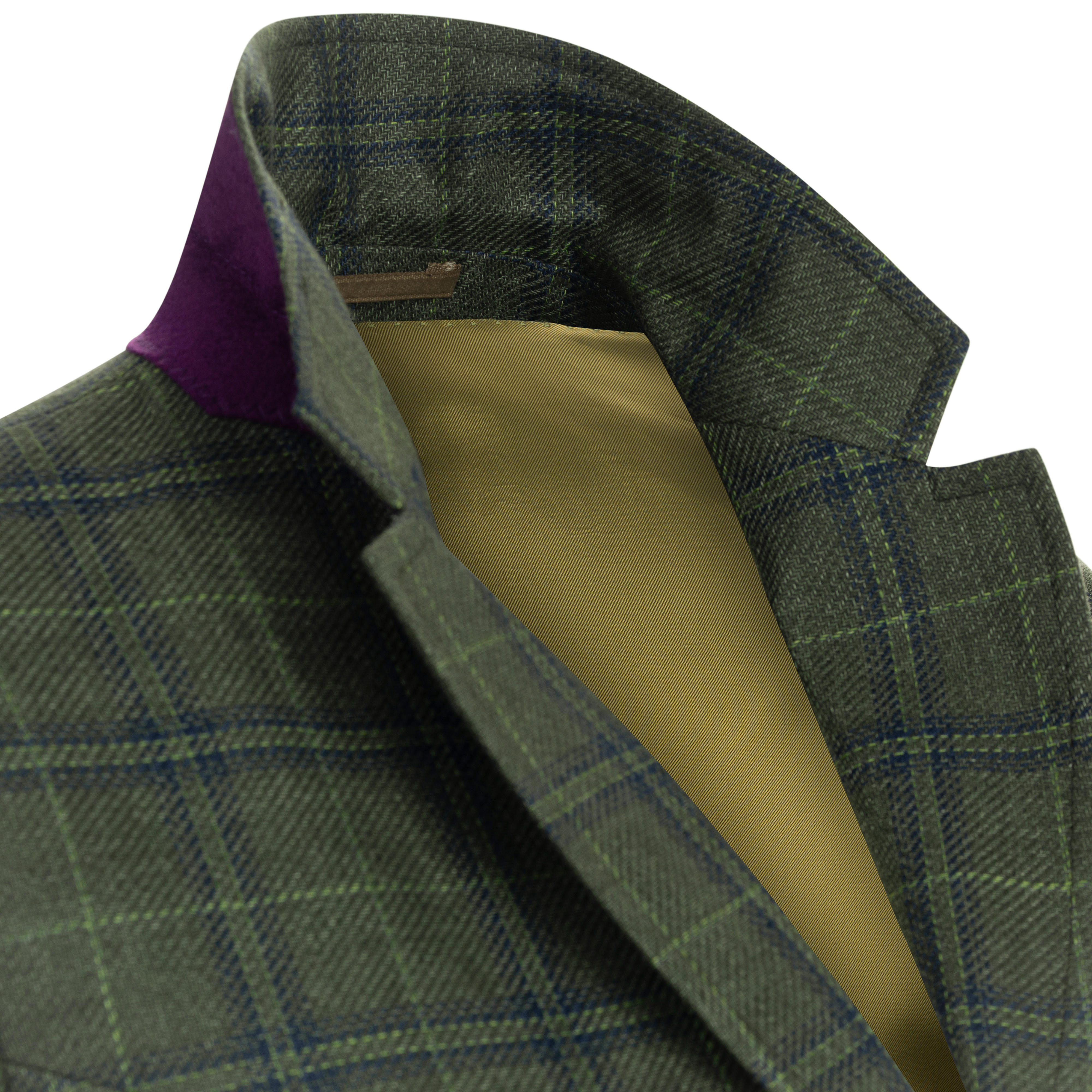 Der Blazer im Reiter-Stil zeichnet sich durch einen lilafarbenen Kragenfilz und sorgfältig abgestimmte Hornknöpfe aus, die perfekt zur sportlichen Schnittführung passen. Mit einer Brustleistentasche, schräg verlaufenden Billett- und Pattentaschen sowie Ärmelpatches aus feinem Veloursleder verkörpert er auf elegante Weise eine ausgewogene Verbindung von sportlicher Raffinesse und zeitloser Stilistik.
