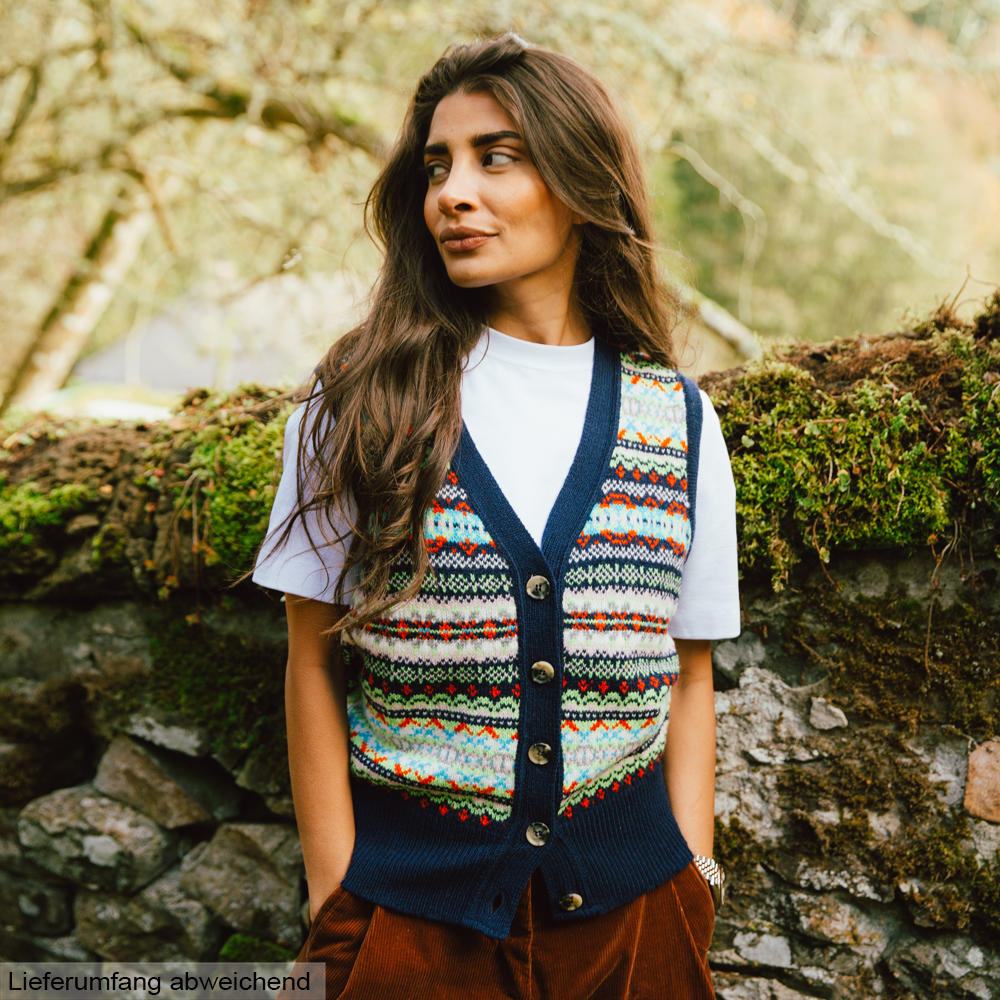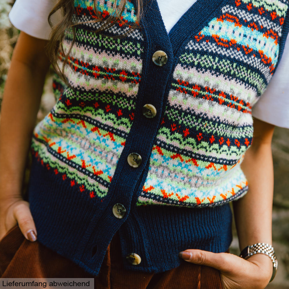 Rosy Eribé, a knitting specialist from Melrose in Scotland, skilfully mixes patterns, colours and materials with great attention to detail, and has thus acquired a special reputation for traditional, but modern Fair Isle patterns. The garments are knitted on state-of-the-art machines, mainly on site and in a small Bulgarian family business specialising in the production of these elaborate circular knitted cardigans and sweaters. The jackets/sweaters tend to be cut short and quite close to the body. They therefore combine well with skirts.