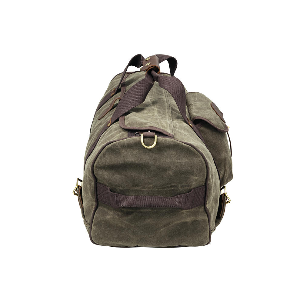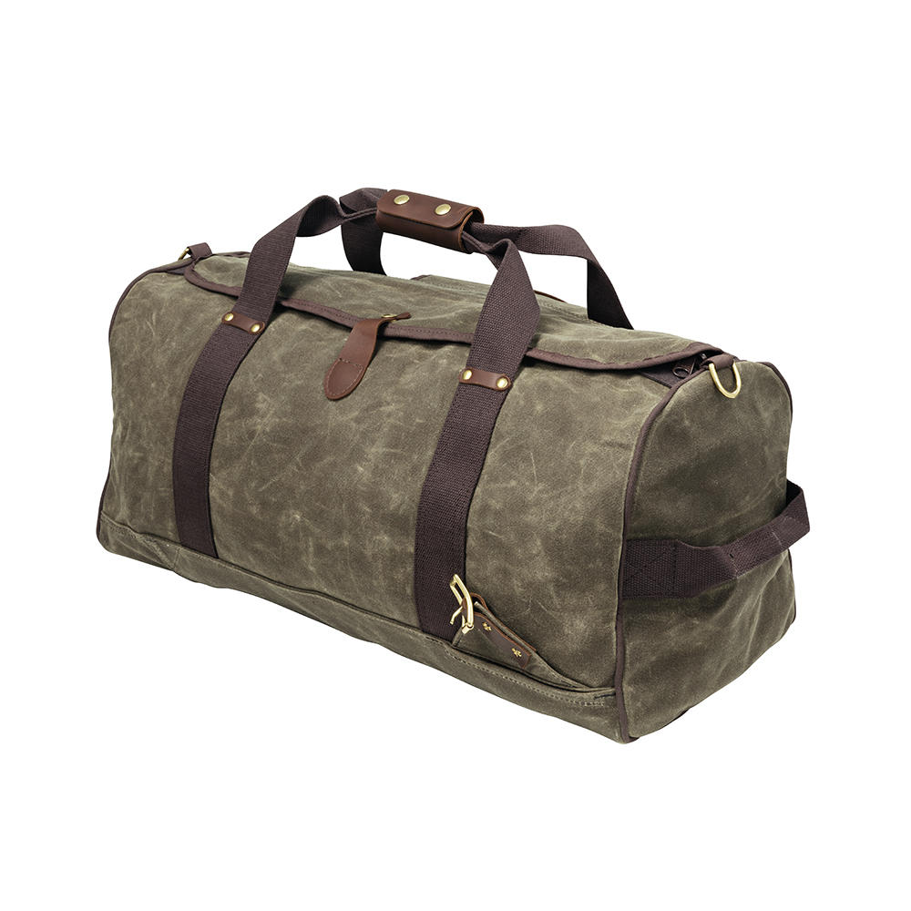 - Material 18 oz. waxed canvas, premium leather, solid brass hardware