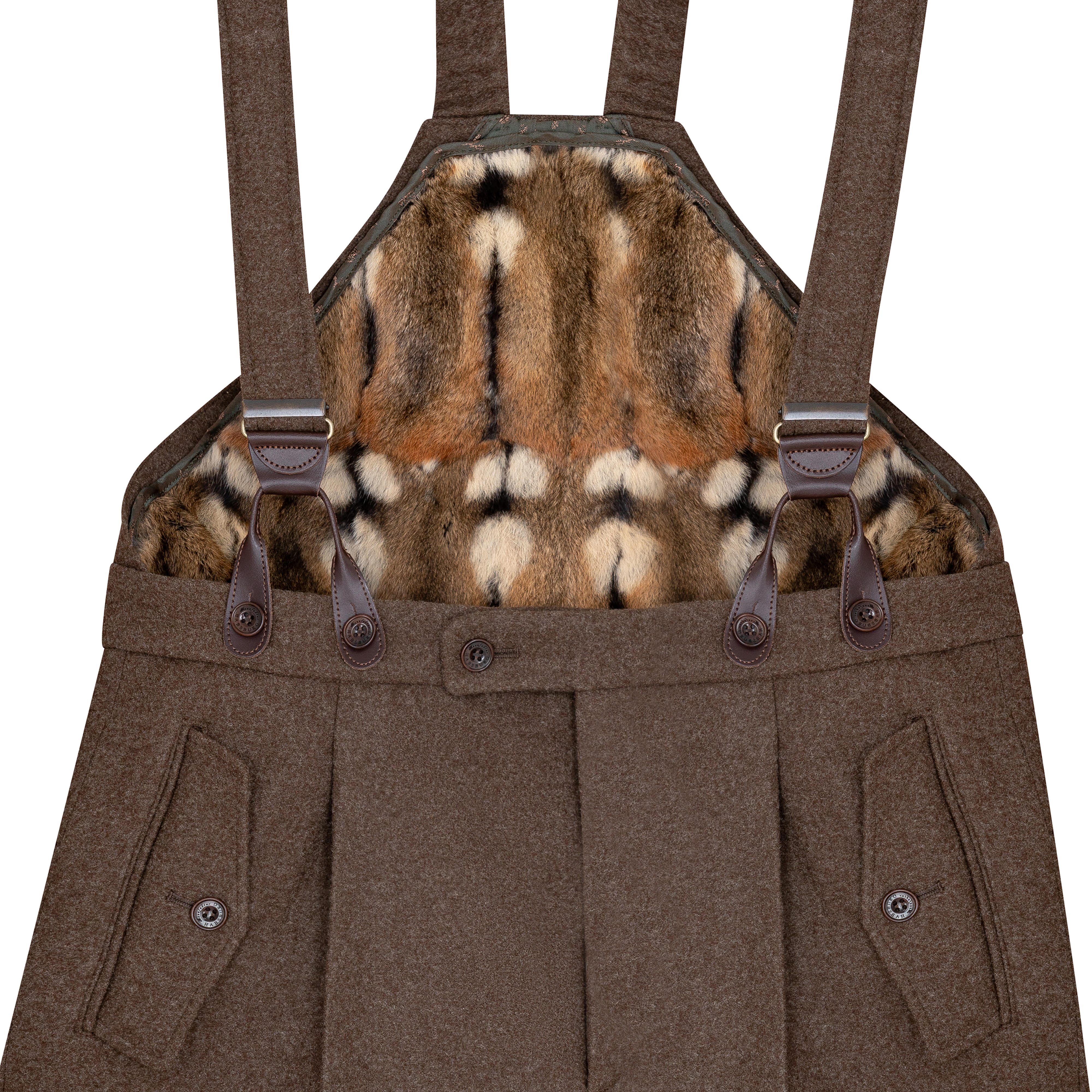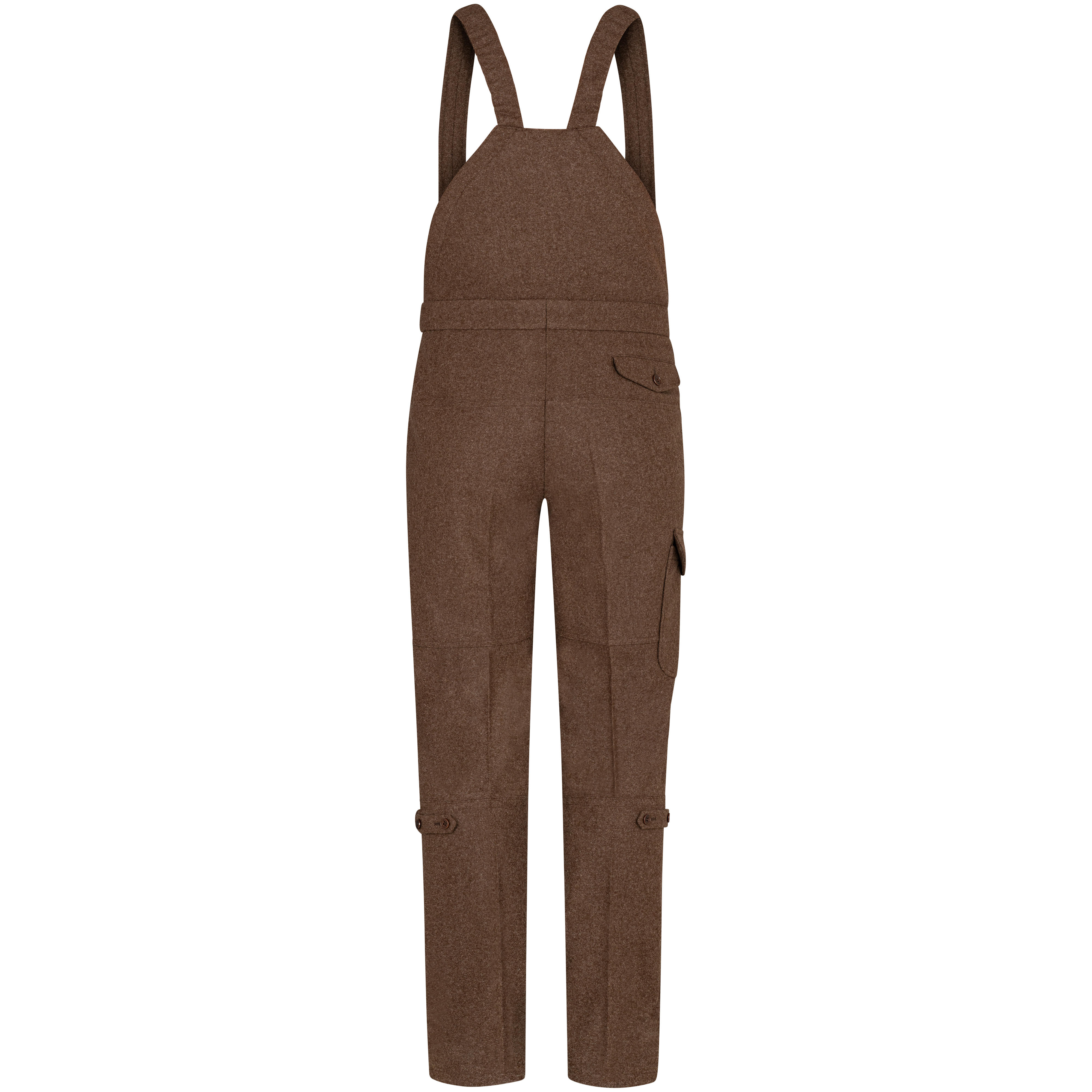The bib straps are attached at the front with adjustable leather loops and can be individually adjusted in length. The trouser leg is adjustable in width below the knee and can be ideally adapted to any boot via a hidden zip.