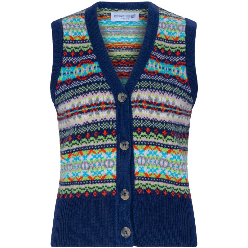 Rosy Eribé, Strickspezialistin aus Melrose in Schottland. Mit sehr viel Liebe zum Detail werden Muster, Farben und Materialien gekonnt gemixt. So hat sie sich einen besonderen Ruf für traditionelle, in der Farbigkeit aber sehr moderne Fair Isle-Muster erarbeitet. Gestrickt wird auf modernsten eigenen Maschinen hauptsächlich vor Ort und in einem kleinen bulgarischen Familienbetrieb, der sich auf die Anfertigung der aufwendigen Rundstrick- Cardigans und -Pullover spezialisiert hat. Die Jacken / Pullover sind eher kurz und recht körpernah gearbeitet. So lassen sie sich gut mit Röcken kombinieren.