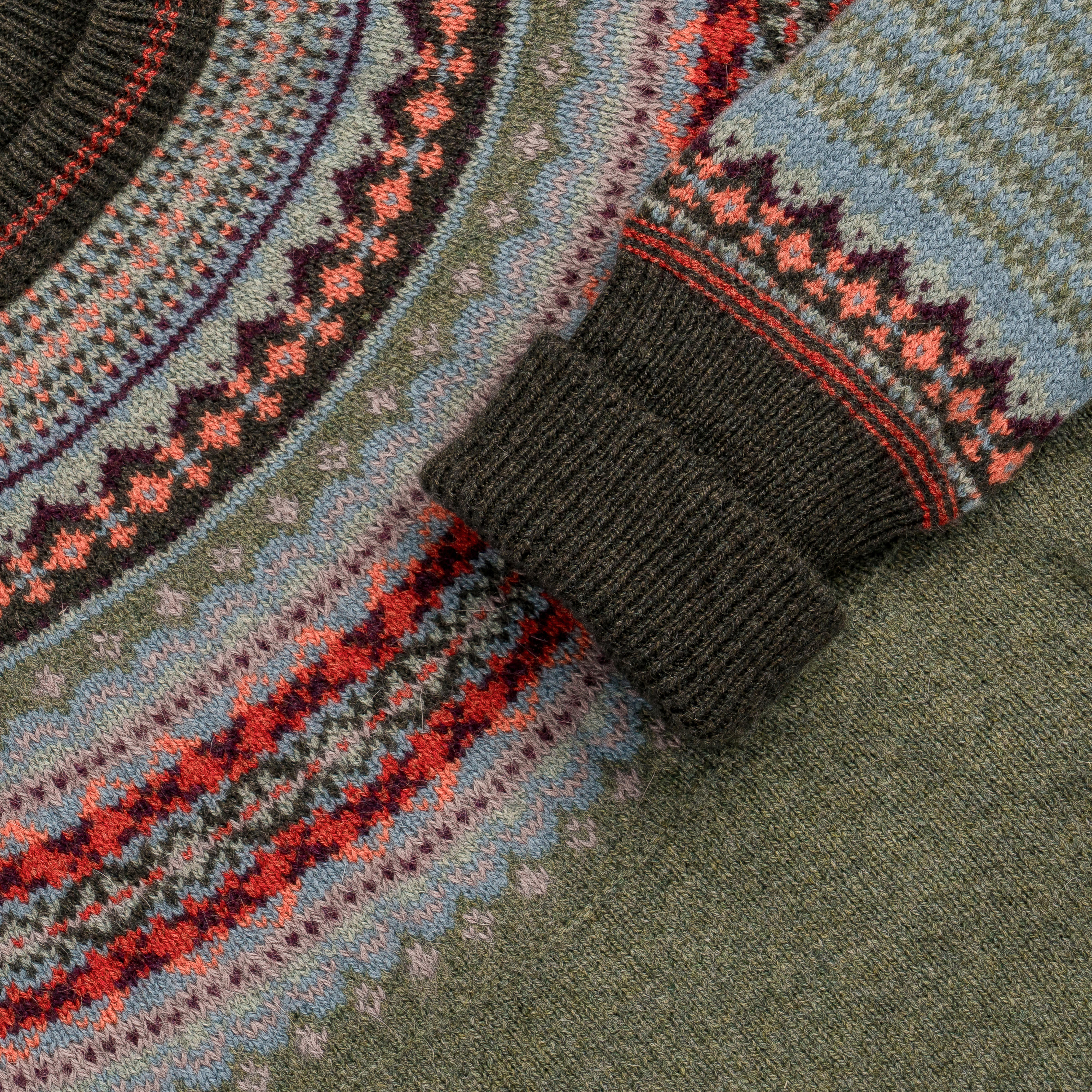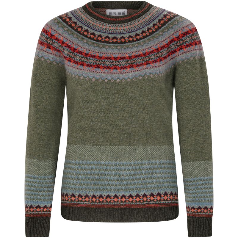 Rosy Eribé, Strickspezialistin aus Melrose in Schottland. Mit sehr viel Liebe zum Detail werden Muster, Farben und Materialien gekonnt gemixt. So hat sie sich einen besonderen Ruf für traditionelle, in der Farbigkeit aber sehr moderne Fair Isle-Muster erarbeitet. Gestrickt wird auf modernsten eigenen Maschinen hauptsächlich vor Ort und in einem kleinen bulgarischen Familienbetrieb, der sich auf die Anfertigung der aufwendigen Rundstrick- Cardigans und -Pullover spezialisiert hat. Die Jacken / Pullover sind eher kurz und recht körpernah gearbeitet. So lassen sie sich gut mit Röcken kombinieren.