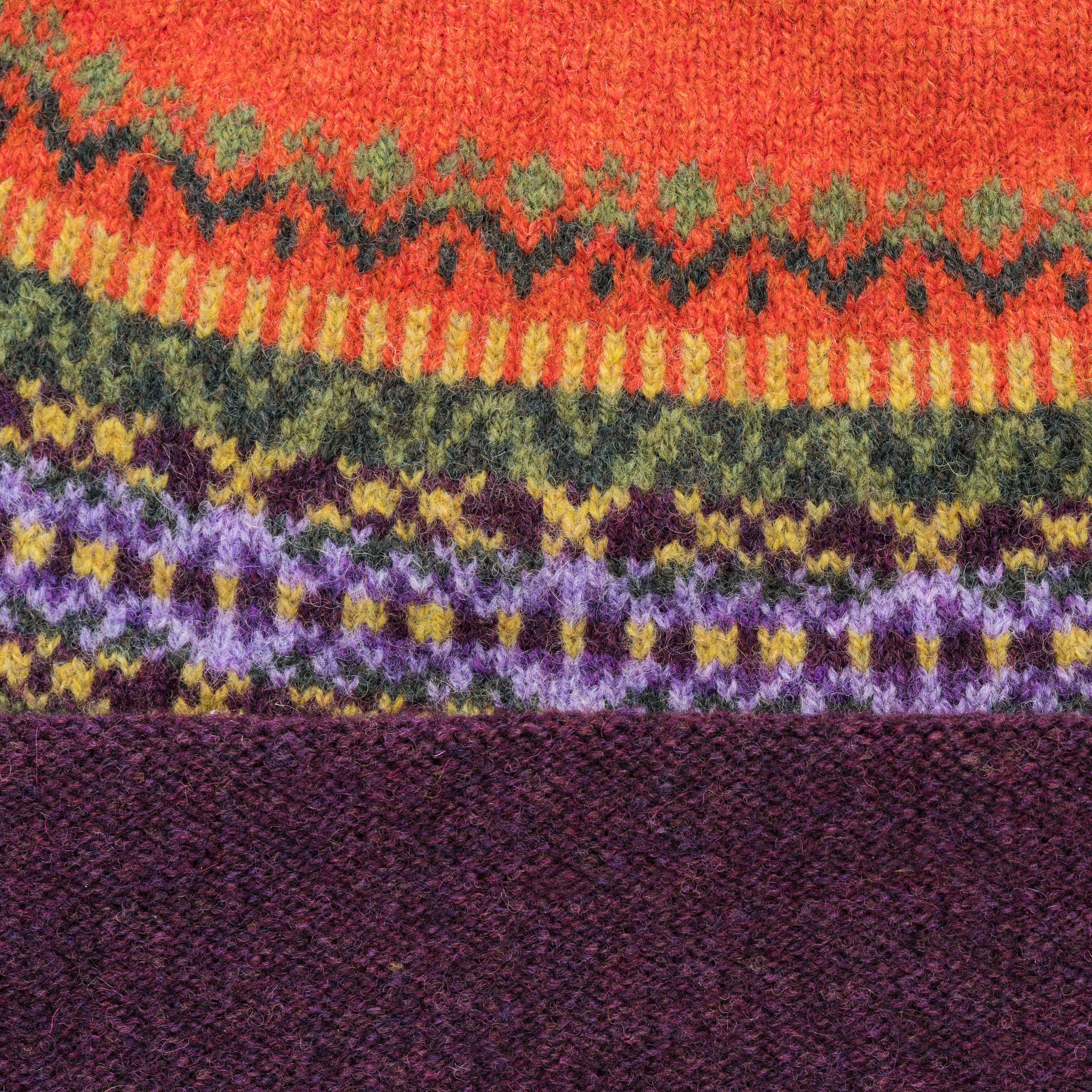 Rosy Eribé, Strickspezialistin aus Melrose in Schottland. Mit sehr viel Liebe zum Detail werden Muster, Farben und Materialien gekonnt gemixt. So hat sie sich einen besonderen Ruf für traditionelle, in der Farbigkeit aber sehr moderne Fair Isle-Muster erarbeitet. Gestrickt wird auf modernsten eigenen Maschinen hauptsächlich vor Ort und in einem kleinen bulgarischen Familienbetrieb, der sich auf die Anfertigung der aufwendigen Rundstrick- Cardigans und -Pullover spezialisiert hat. Die Jacken / Pullover sind eher kurz und recht körpernah gearbeitet. So lassen sie sich gut mit Röcken kombinieren.