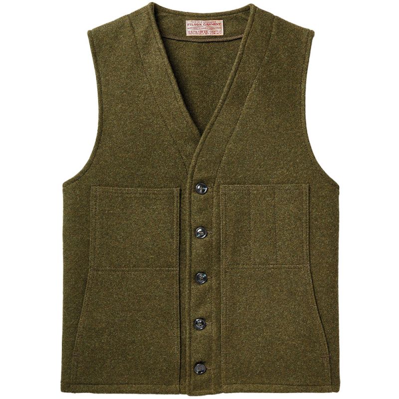 Die Mackinaw Wool Vest wird aus der gleichen warmen Wolle wie die Filson Mackinaw Wool Cruiser Jacke gefertigt, die seit über einem Jahrhundert vor Kälte und Nässe schützt. Mackinaw-Wolle ist ungewöhnlich dicht gewebt, deshalb ist sie besonders winddicht und hält jahrzehntelangem Gebrauch stand. Aufgrund ihrer komplexen Faserstruktur bietet Mackinaw-Wolle einen weiteren unerwarteten Vorteil - sie ist sehr pflegeleicht. Getrockneter Schmutz lässt sich leicht abbürsten und hinterlässt keine Spuren. Um Gerüche zu entfernen, darf die trockene Mackinaw Wool Vest sogar in den Wäschetrockner. Diese Weste eignet sich übrigens auch als Indoorbekleidung, nicht nur in zugigen Lagerhallen oder auf frostigen Baustellen, sondern auch und gerade für sitzende Tätigkeiten und fürs Büro. Der klassische V-Ausschnitt passt sich jedem Stil an und trägt nicht auf, deshalb lässt sich problemlos eine weitere Kleidungsschicht, beispielsweise ein dickes Hemd oder eine Regenjacke mit kinnhohem Reißverschluss, darübertragen. Die Eingrifftaschen haben einen erhöhten Außenrand, damit der Inhalt nicht herausfällt. Von den beiden Brusttaschen ist eine offen und eine in drei Stiftfächer unterteilt. Mit der Mackinaw-Wollweste macht Mann eine gute Figur, drinnen und draußen - ein Key-Piece in jeder gut ausgestatteten Garderobe.