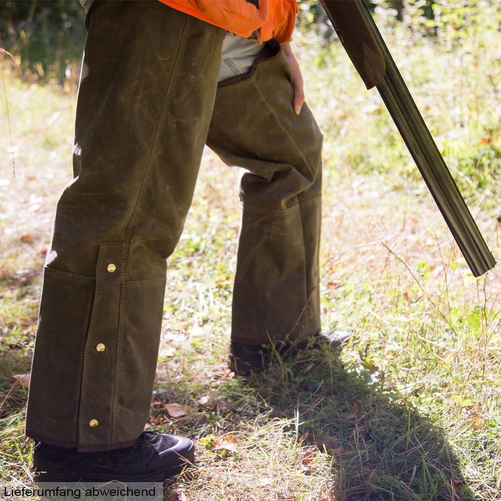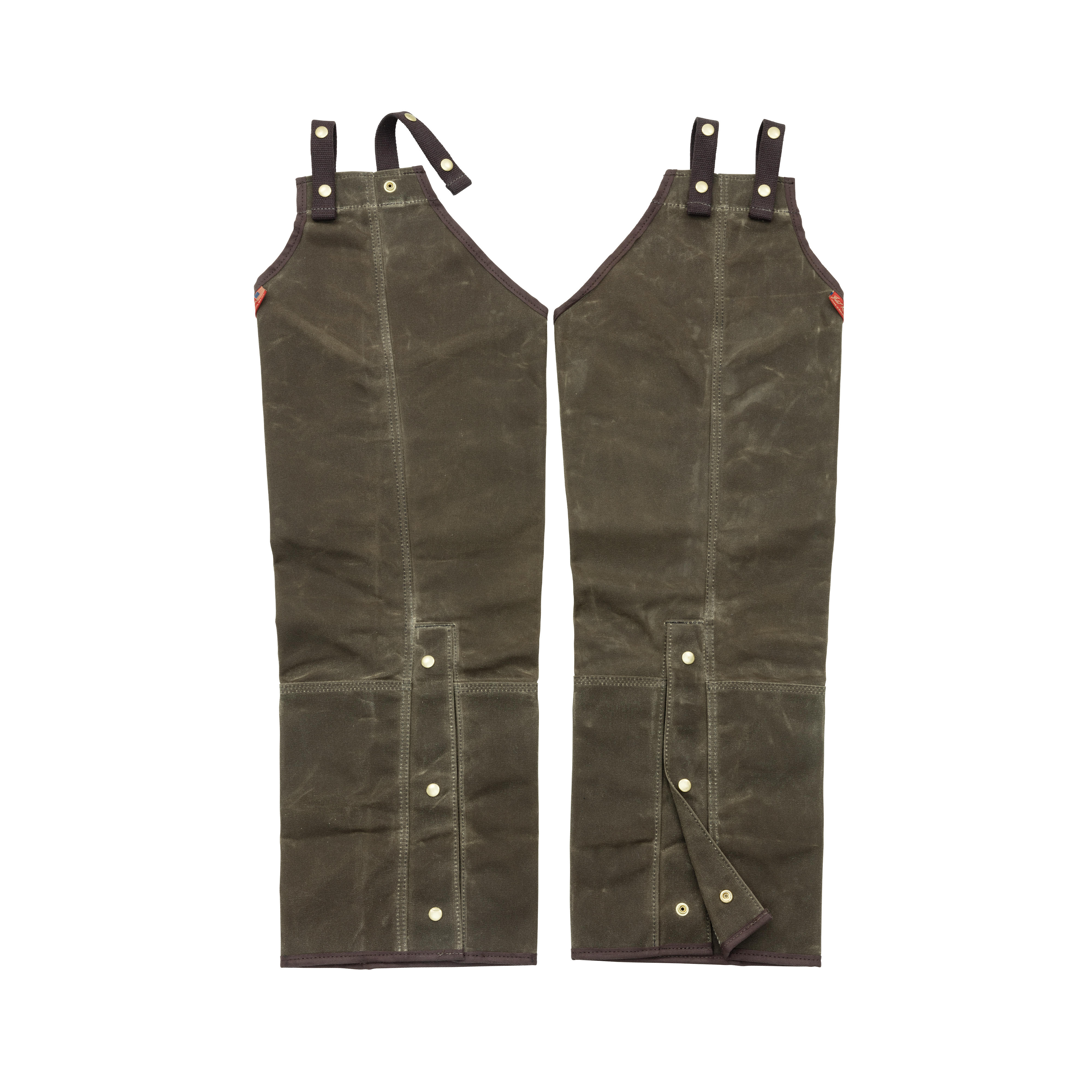 Fabriquées en toile cirée 18 oz robuste et en tissu de coton, ces cuissardes sont anti-épines, coupe-vent et imperméables. Grâce à leur conception facile à enfiler par-dessus, elles sont extrêmement pratiques à porter. Les larges ouvertures aux chevilles peut être fermées en toute sécurité à l'aide de boutons-pression en laiton massif, tandis que la grande fente facilite l'enfilage de bottes lourdes.