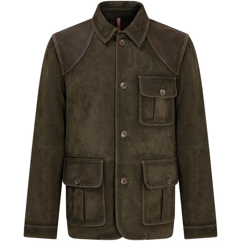 Die durchgehende Knopfleiste und der abgerundete Abschluss an der unteren Vorderseite betonen die zeitlose Eleganz dieses Modells. Besondere Akzente setzen die markanten Schulterpatches aus beschichtetem Ziegenveloursleder, die der Jacke eine markante Silhouette verleihen. Praktische Stauraummöglichkeiten bieten die aufgesetzte Brusttasche mit Patte sowie die zwei unteren Blasebalgtaschen mit Patte und seitlichem Schnellzugriff, die Platz für alle wichtigen Utensilien des Alltags bieten.