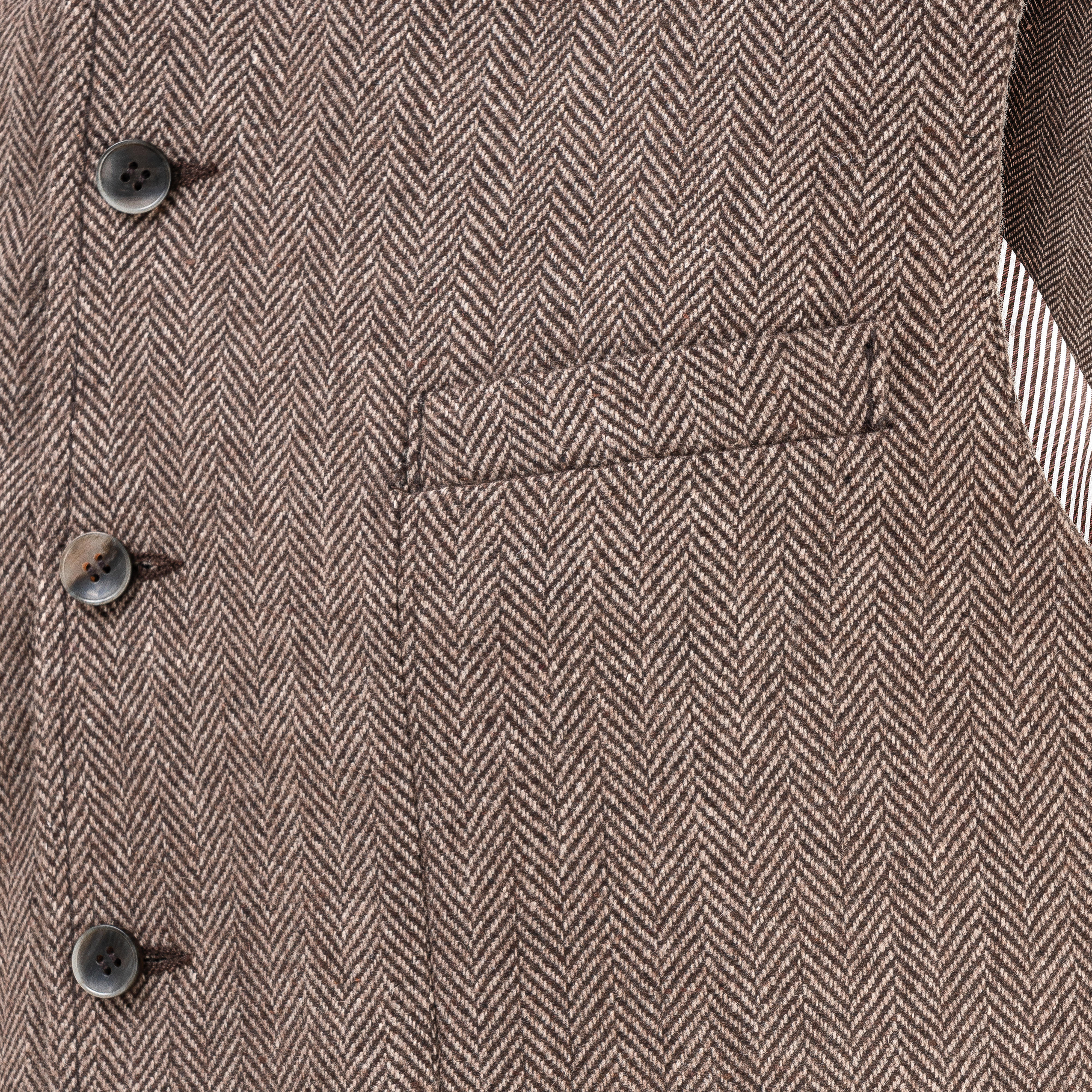 Aus robustem Tweed-Stoff im Fischgrat-Design erweist sich die markante Weste »Dandy« als eleganter Allrounder zu stilvollen Looks. Zwei Pattentaschen, eine paspelierte Brusttasche, fein akzentuierte Ziernähte und die 6-Knopfleiste runden das Design gelungen ab. Das Rückenteil ist ebenfalls aus Tweed-Stoff gefertigt und kann mit einem Gurt aus tonig abgestimmtem Ziegenveloursleder individuell in der Weite angepasst werden. Gefüttert ist die Weste mit einem blau/weiß gestreiften Baumwollfutter. Die Tweed-Weste können Sie sowohl hochgeknöpft à la »Edwardianischer Look« tragen oder klassisch mit umgelegtem Revers, in dem man nur 2 oder 3 der vorderen Taillenknöpfe schließt.