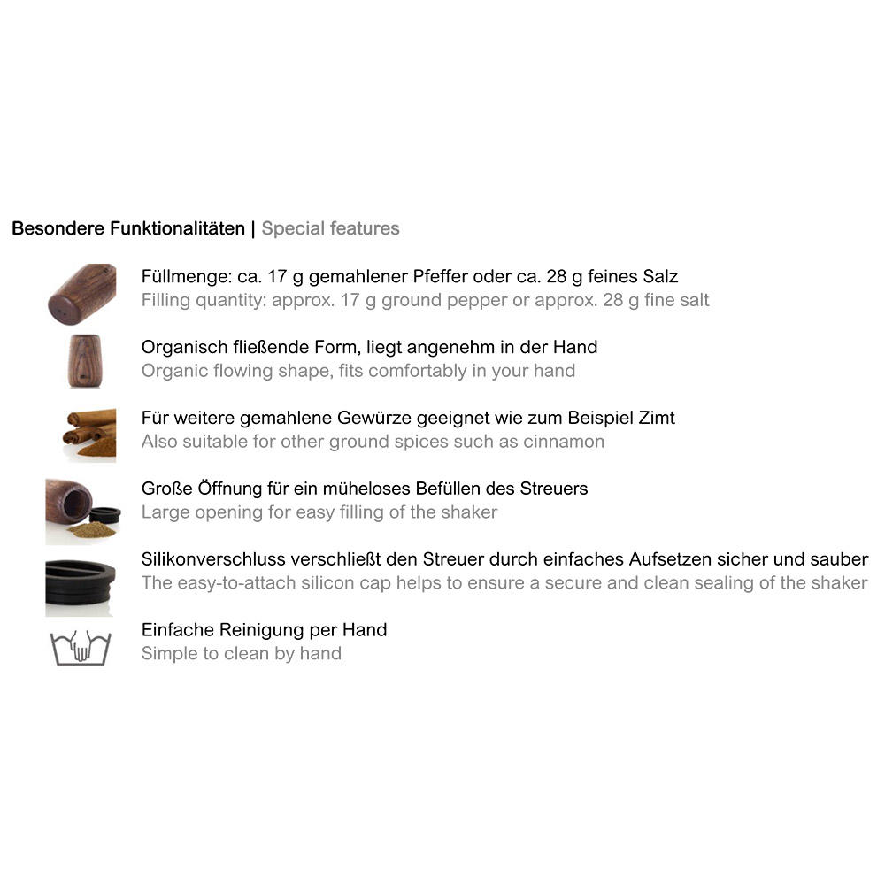 - Geeignet für gemahlene Gewürze wie z. B. Salz, Pfeffer und Zimt