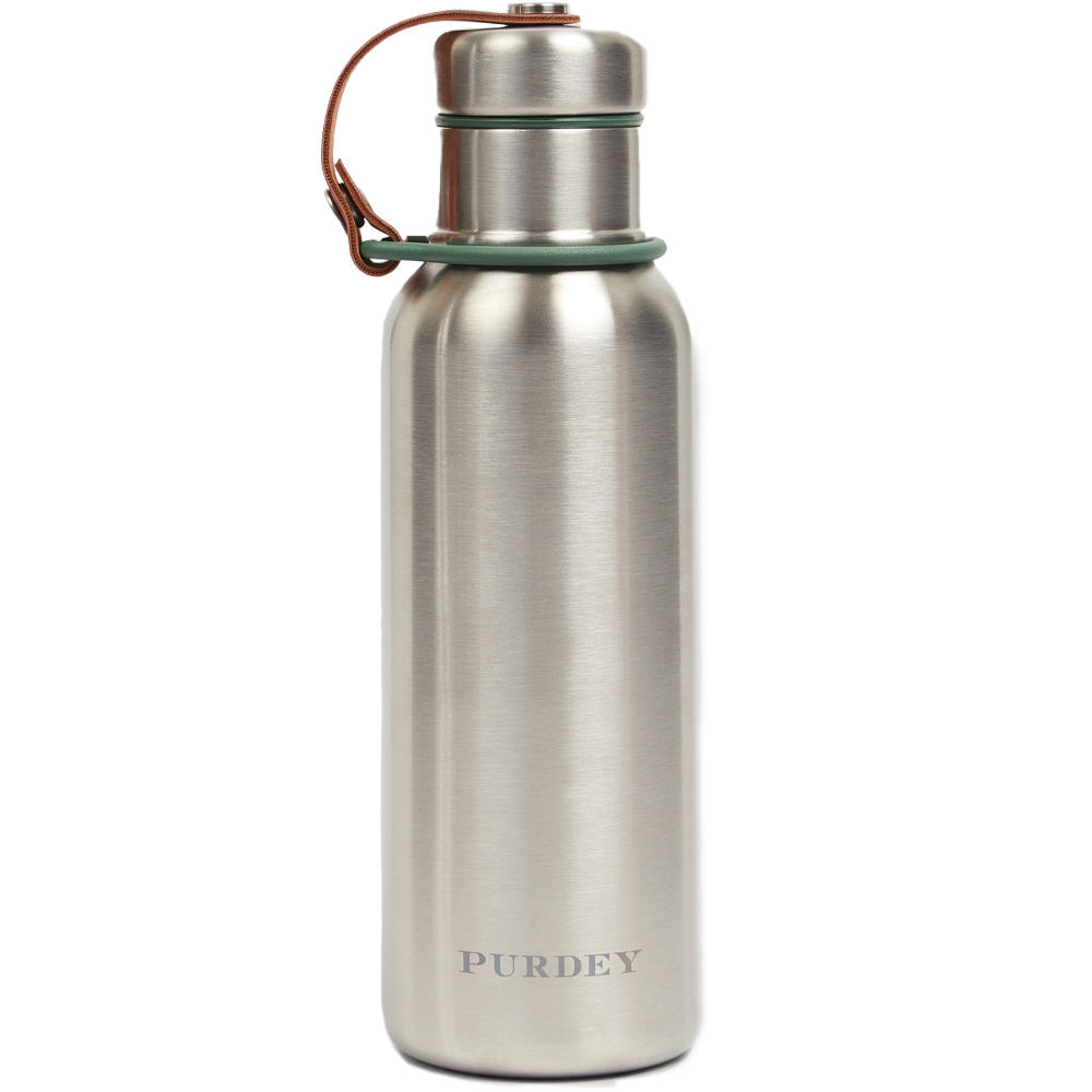 Der abnehmbare Tweed-Überzug mit Purdey-Logo verleiht der Flasche eine zeitlose, klassische Ästhetik, während der vegane Ledertrageriemen am Deckel für praktischen Tragekomfort sorgt.