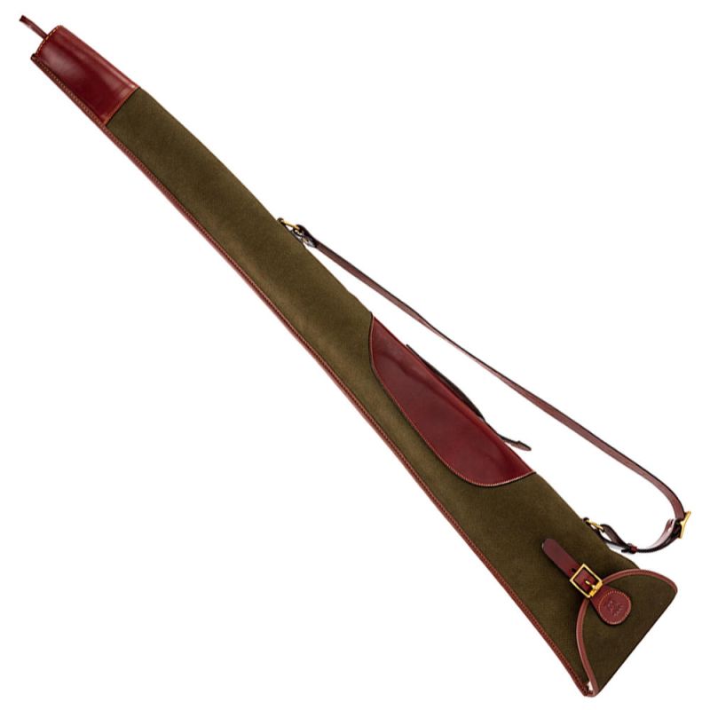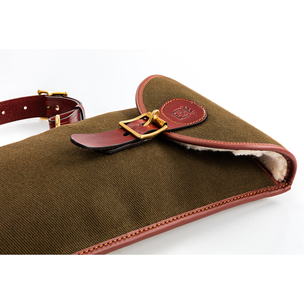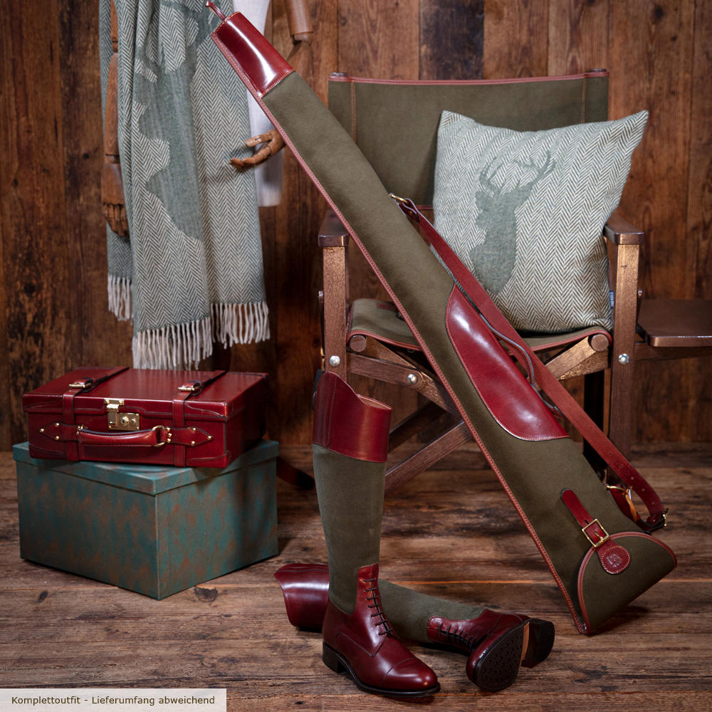 Das handgefertigte Flintenfutteral aus strapazierfähigem hochwertigen 24oz Canvas und pflanzlich gegerbtem Rindsleder bietet optimalen Schutz. Das Innenfutter aus weichem Webpelz schützt Ihre Waffe vor Stößen und Kratzern. Die Mündung Ihrer Flinte ist durch eine Verstärkung aus robustem Rindsleder zusätzlich geschützt. Die Lasche ermöglicht einen bequemen Einschub von hinten während der Jagd, sie verfügt über einen Ösenverschluss zur Anbringung eines Sicherheitsschlosses für den gesicherten Transport. Für den komfortablen Transport verfügt das Futteral über einen abnehmbaren und in der Länge verstellbaren Schulterriemen aus Leder. Details wie Schließen aus massivem Messing oder die praktische Aufhängschlaufe aus Leder unterstreichen die Wertigkeit. Der harmonische Kontrast der verschiedenen Materialien und das angenehme Gewicht machen das Futteral zu einem edlen und praktischen Accessoire für die stilvolle Jägerin oder den stilvollen Jäger.
