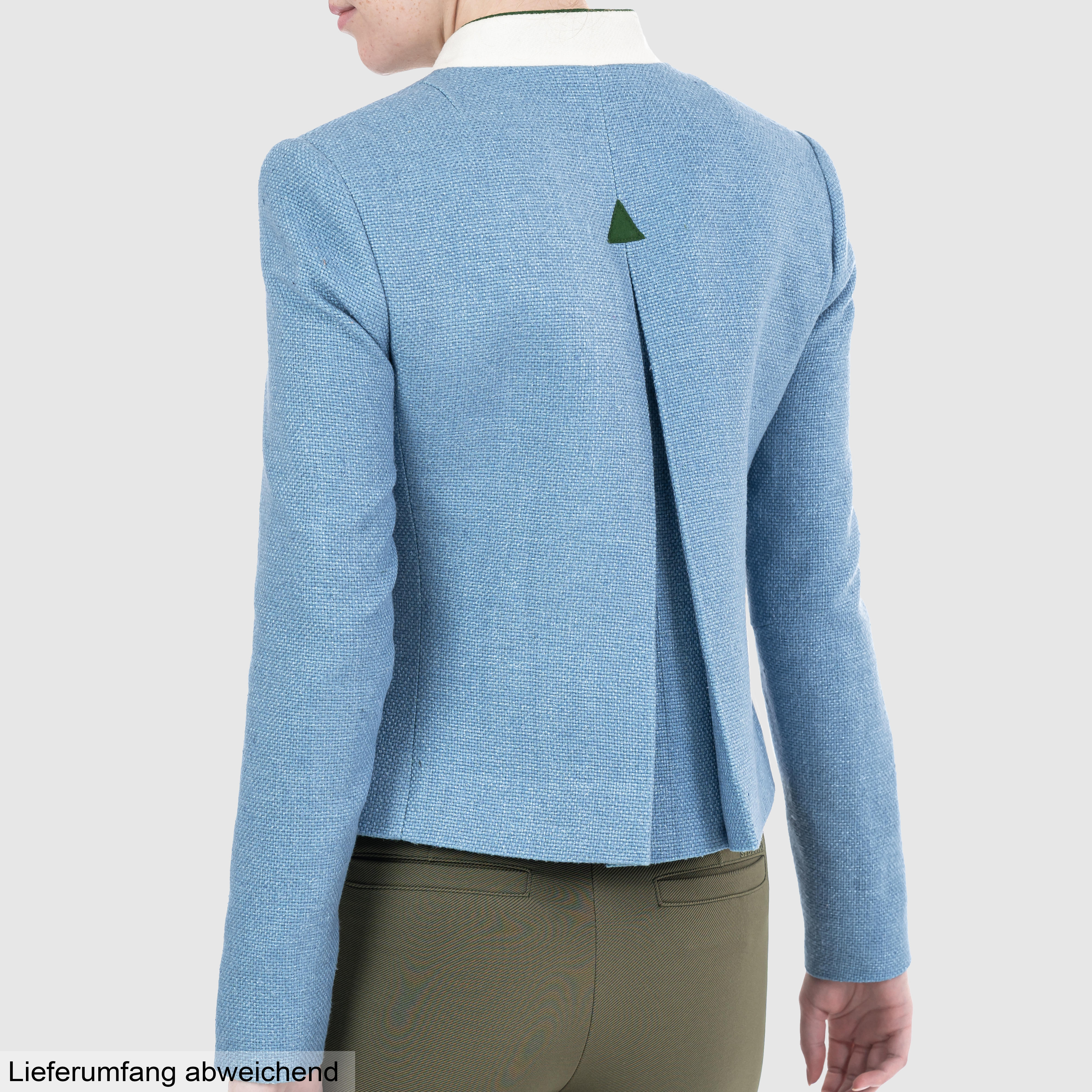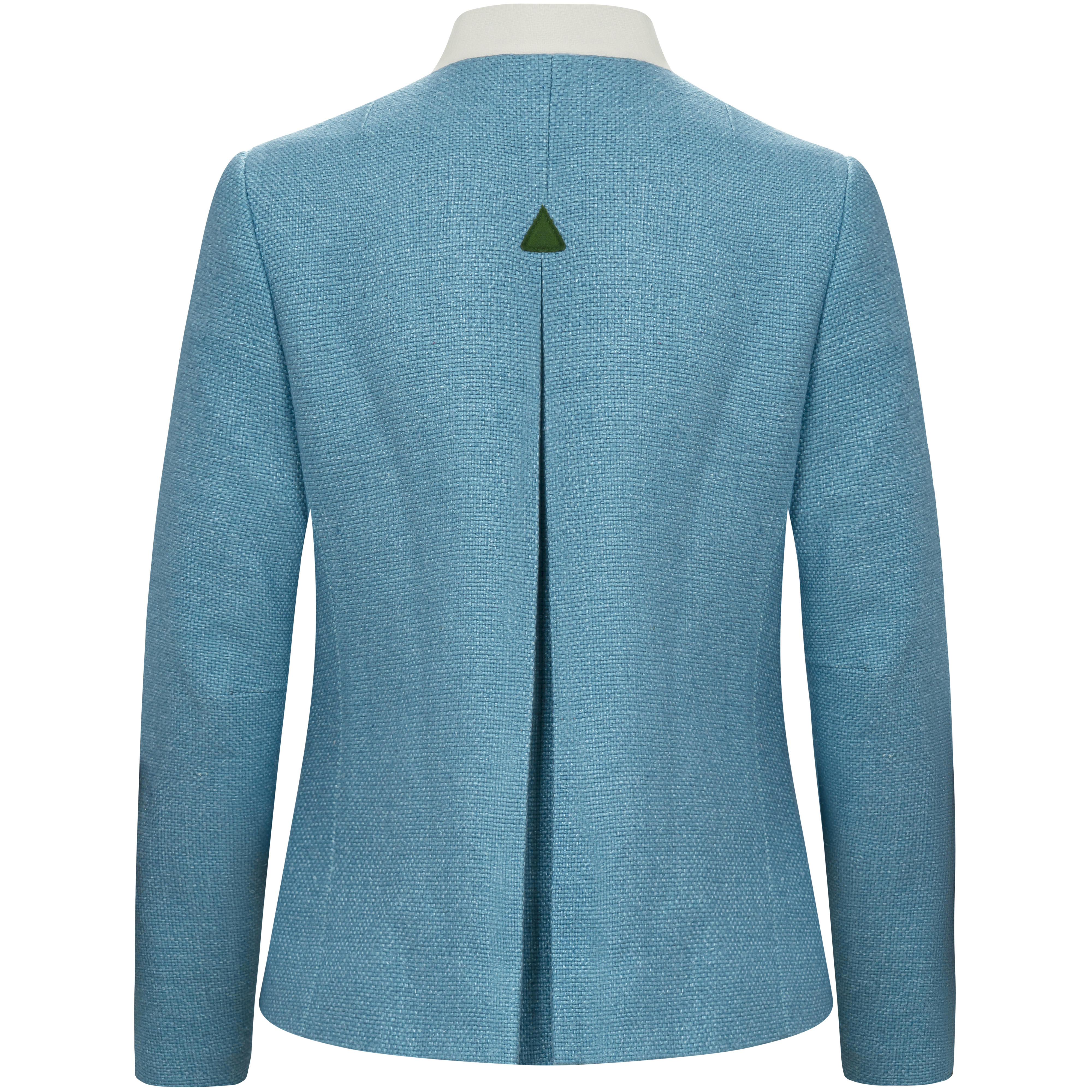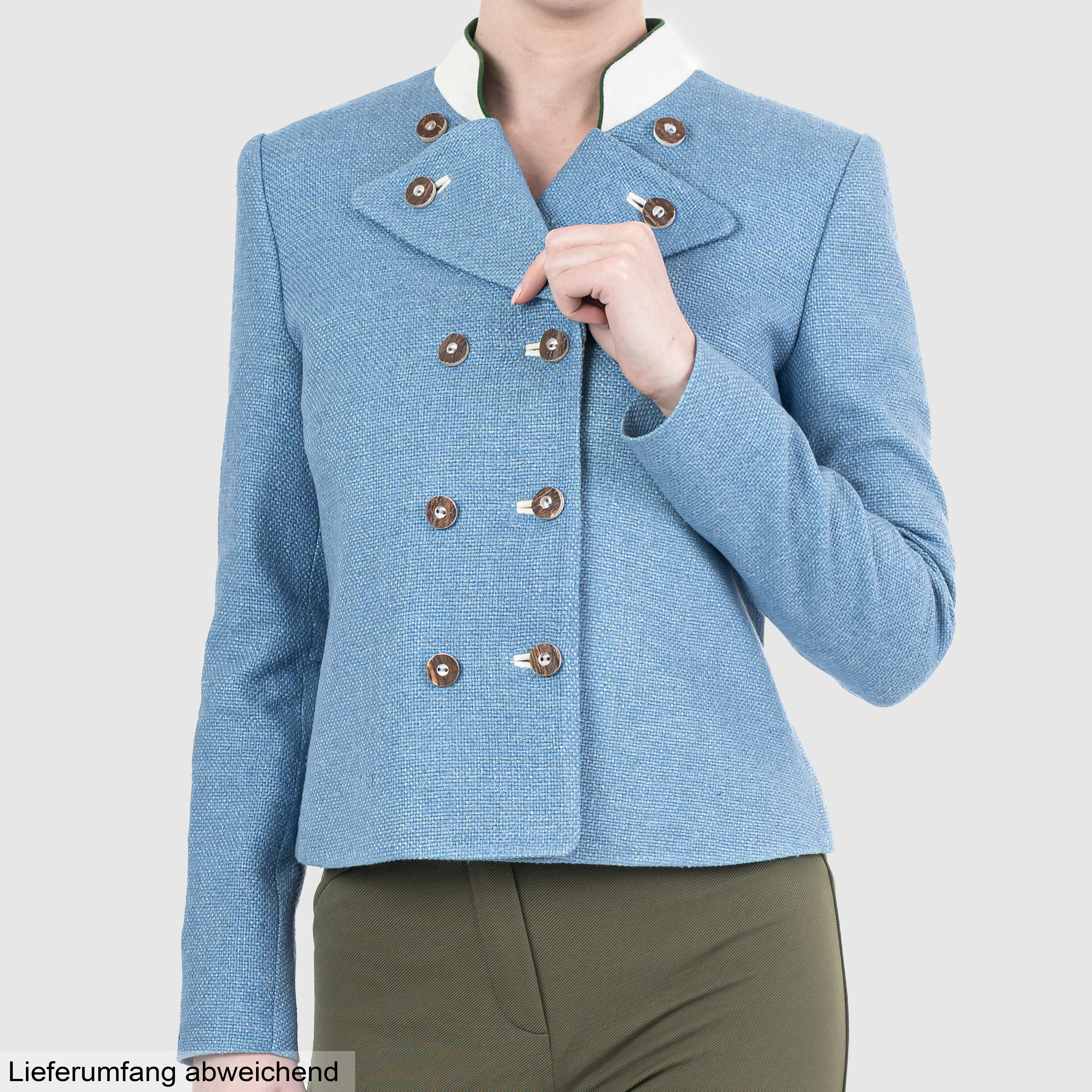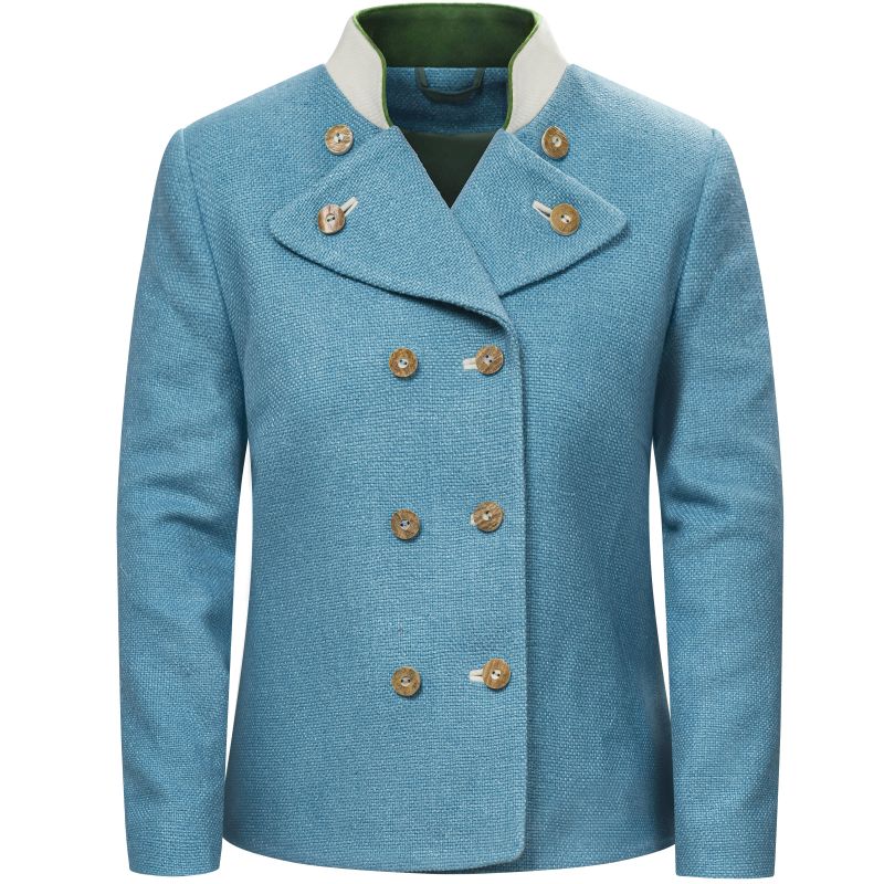 Das Design besticht durch einen schmalen Stehkragen und ein sorgfältig gestaltetes Revers, verziert mit echten Hirschhornknöpfen, was dem Janker eine unverwechselbare Ästhetik verleiht. Der leicht taillierte, aber bequem sitzende Schnitt schmeichelt der weiblichen Silhouette, während das zweireihige Design und die Hirschhornknöpfe den traditionellen Charme betonen. Eine raffinierte Kellerfalte im Rückenteil sorgt zudem für optimale Bewegungsfreiheit.