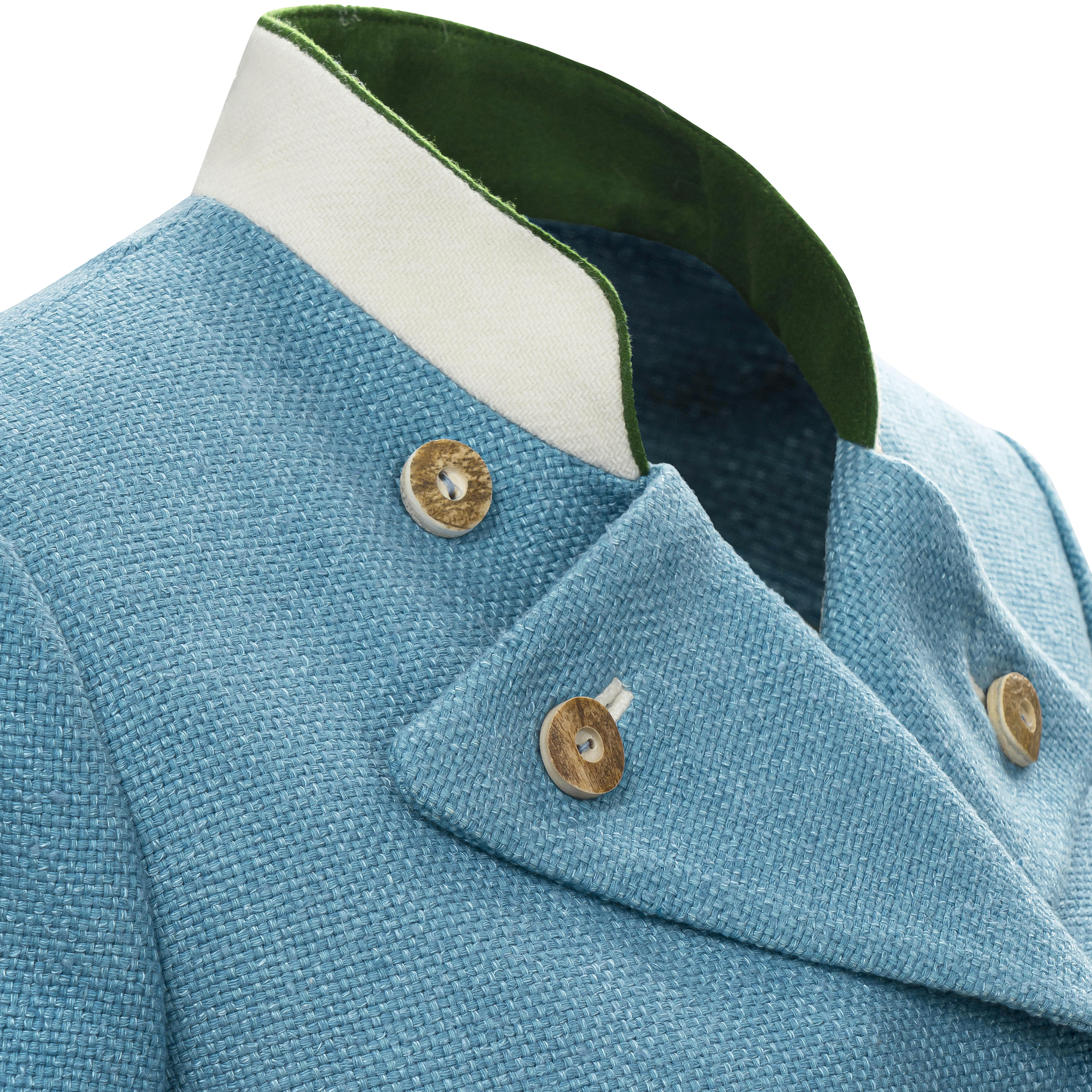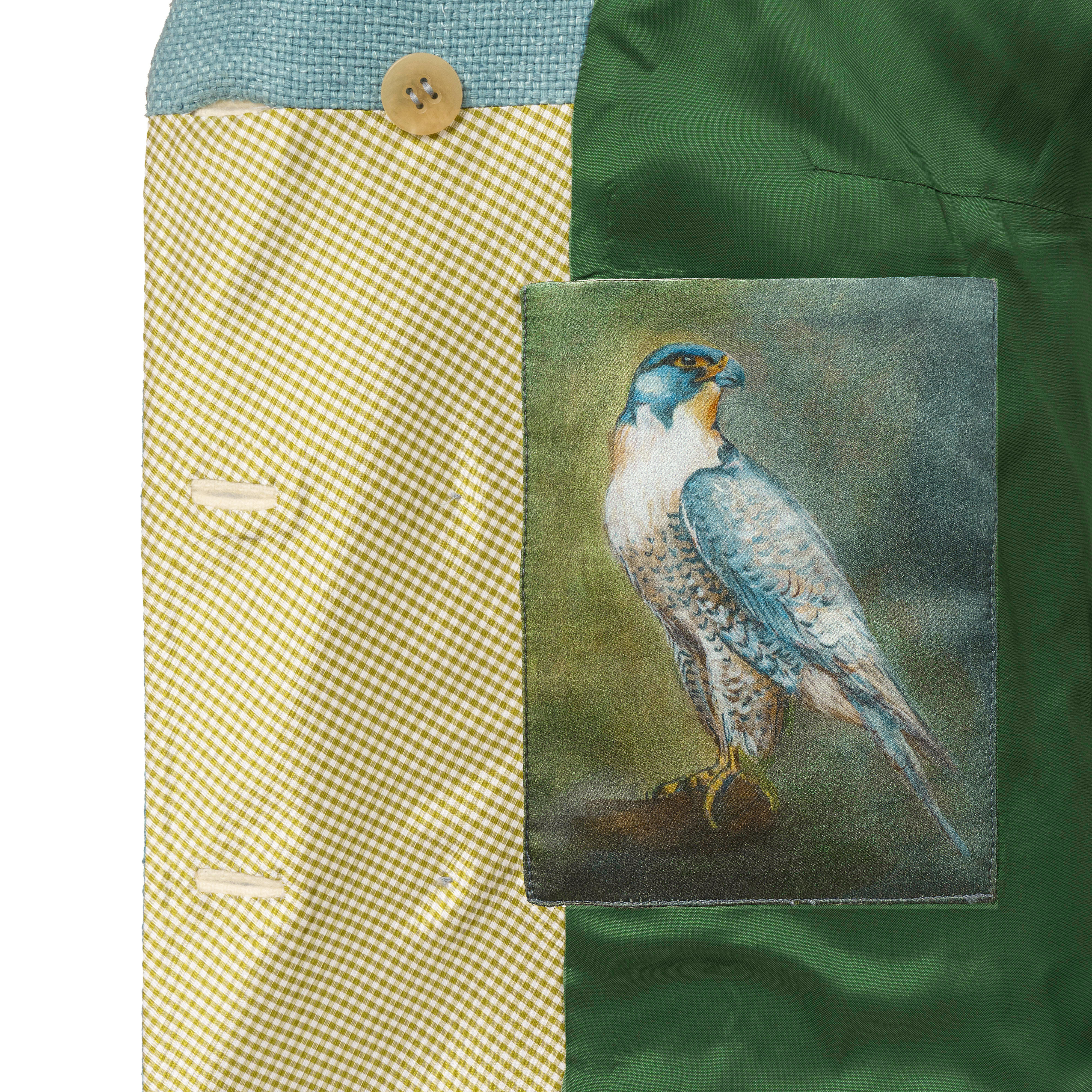 Das zarte Hellblau des Jankers, inspiriert von der Welt der Falknerei, symbolisiert Himmel, Freiheit und Emotionen, die Falken im Flug erleben. Diese Farbwahl schafft eine einzigartige Verbindung zur Natur und zur Tradition der Jagd, die dem Janker eine tiefere Bedeutung verleiht. Das von Brigitte Stajan handgemalte Innenfutter mit dem edlen Falkenmotiv unterstreicht diese subtile Eleganz und macht den Janker zu einem unverwechselbaren Highlight - eine Hommage an die Eleganz und Freiheit der Falken, stilvoll eingefangen in diesem Kleidungsstück.