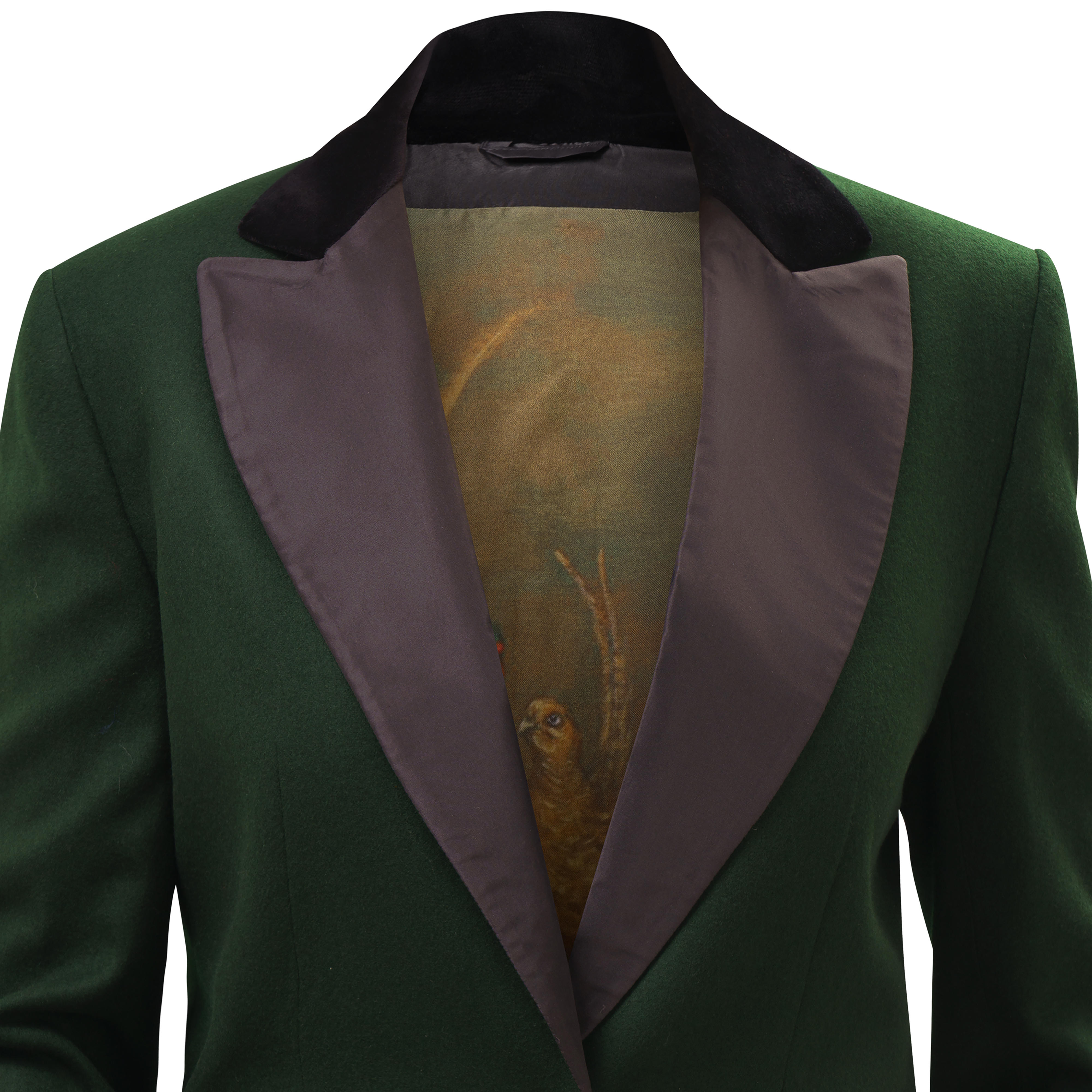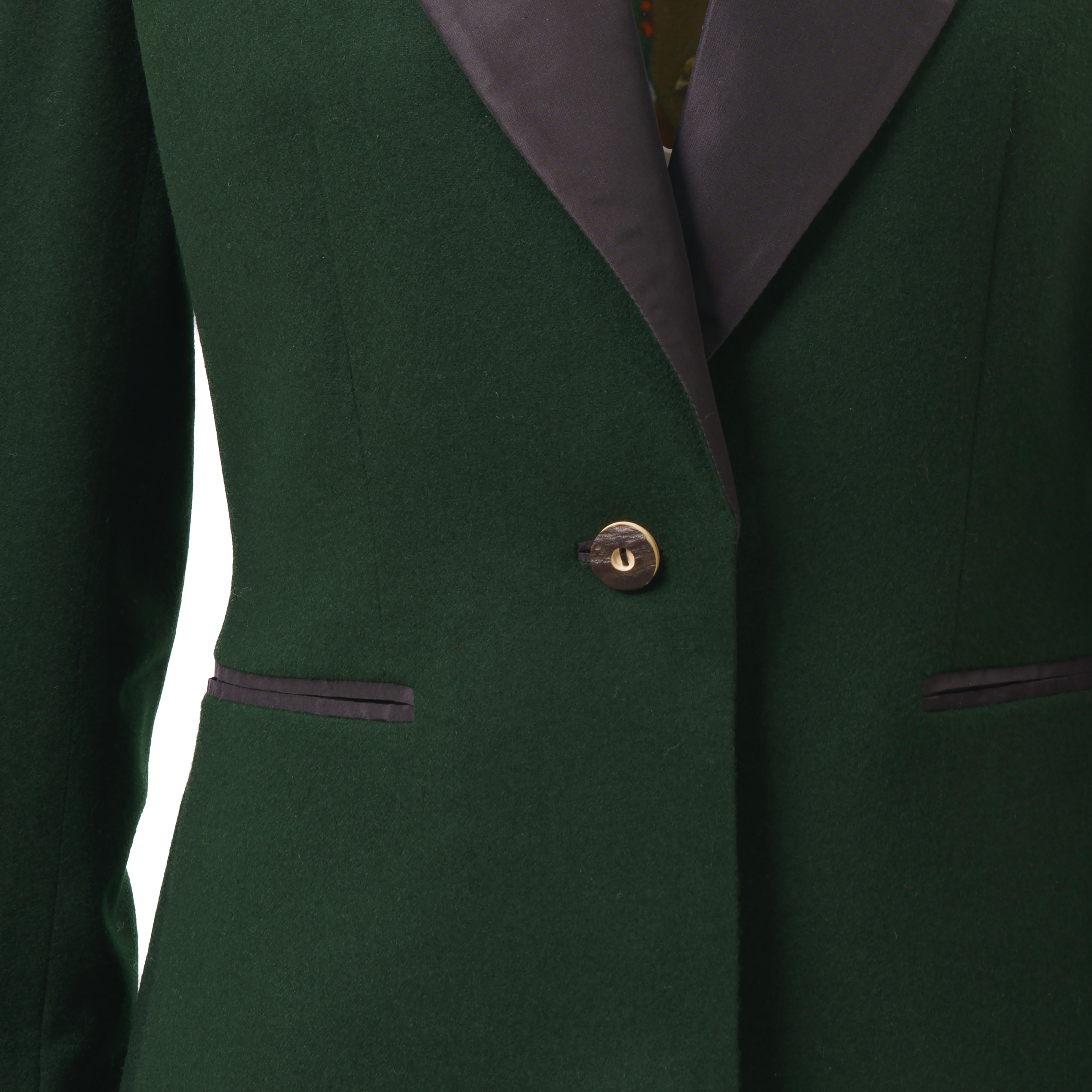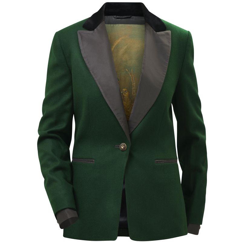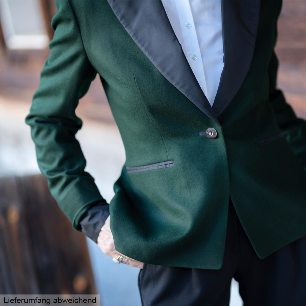 Hervorstechende Details wie der tiefe Reverskragen aus reiner Seide, die beiden Seitenschlitze im Rückenteil, handgefertigte Knopflöcher und der markante Hirschhornknopf verleihen dem Blazer jagdliche Noblesse und Charakter. Das handgemalte Innenfutter von Brigitte Stajan unterstreicht gekonnt die subtile Eleganz und macht den Blazer zu einem absoluten Highlight.