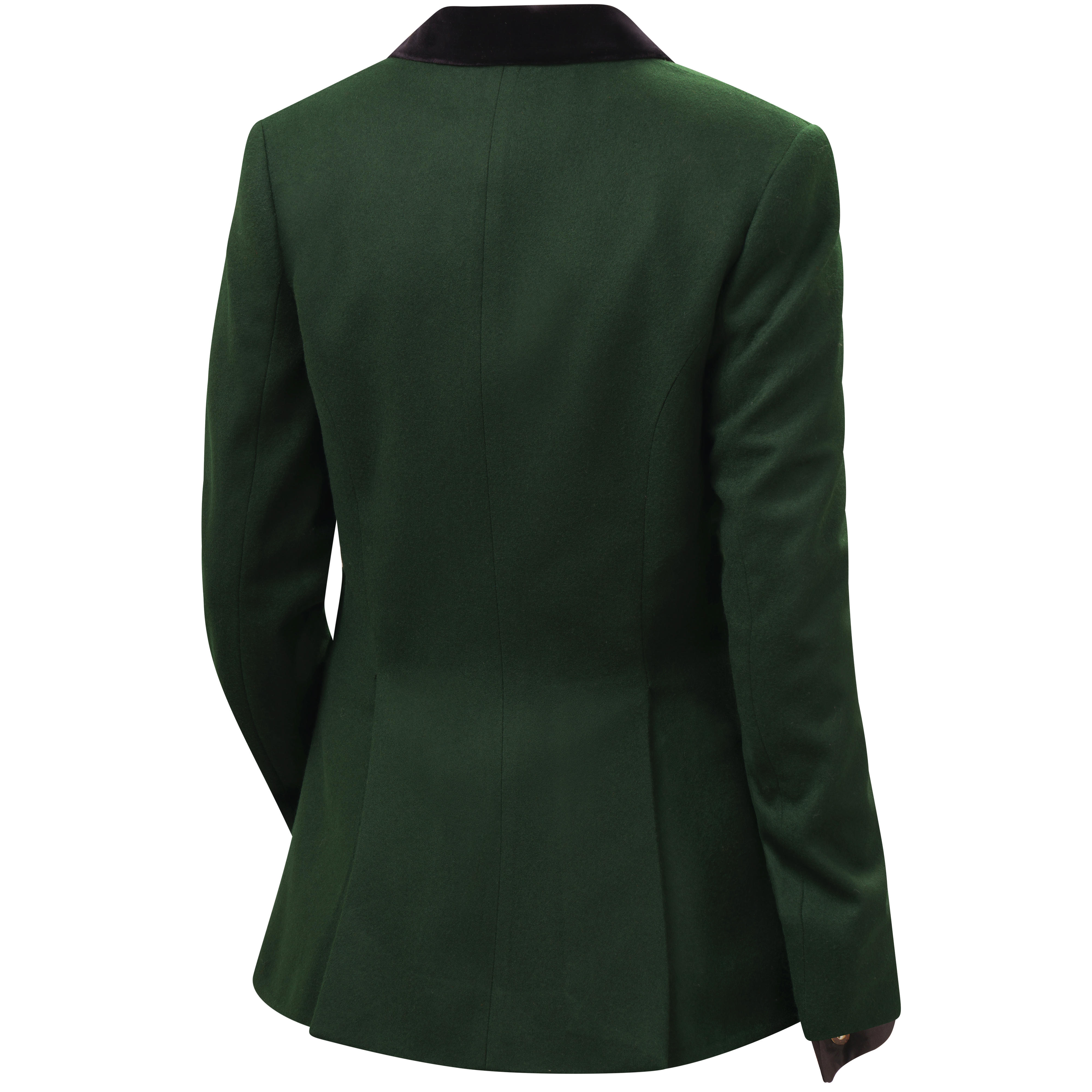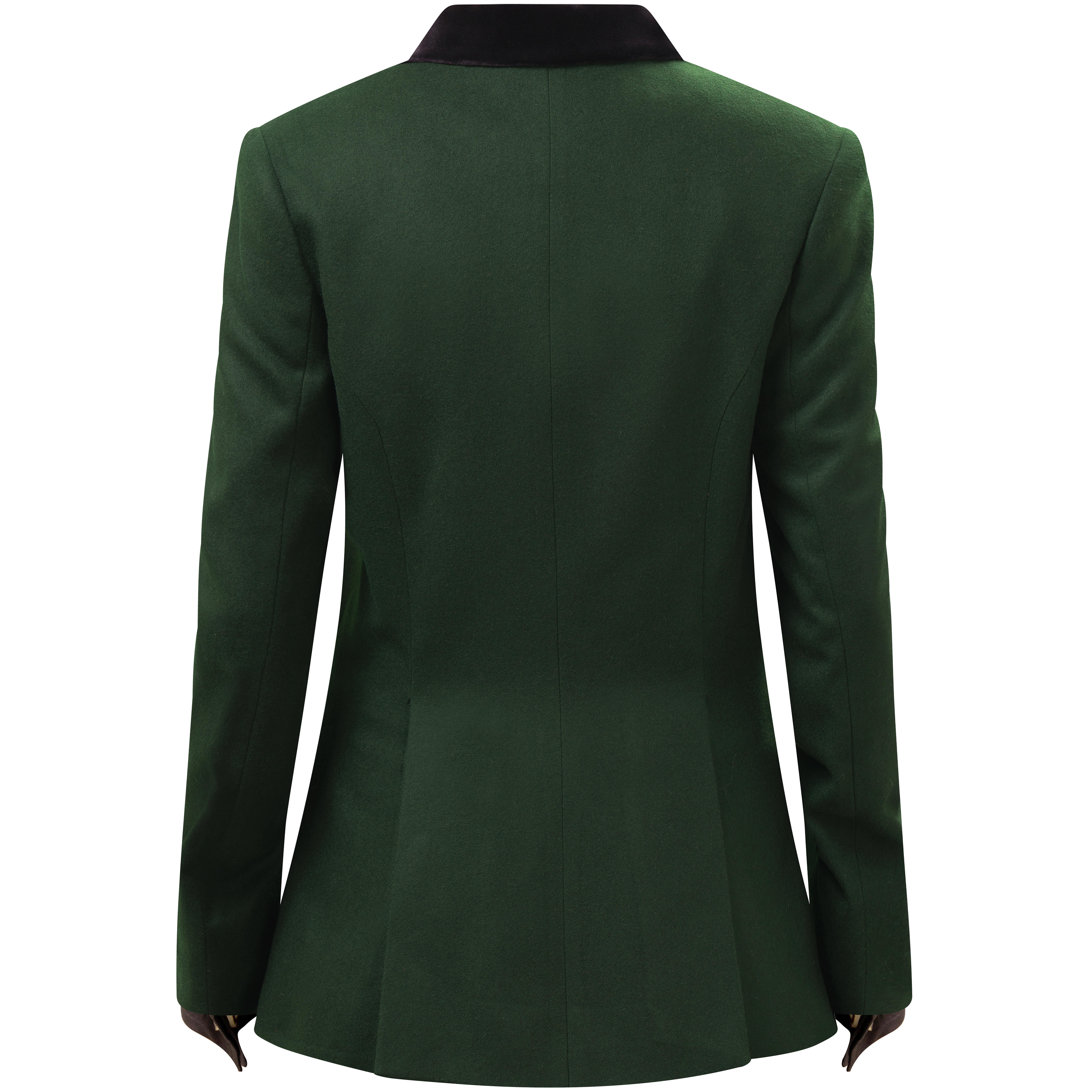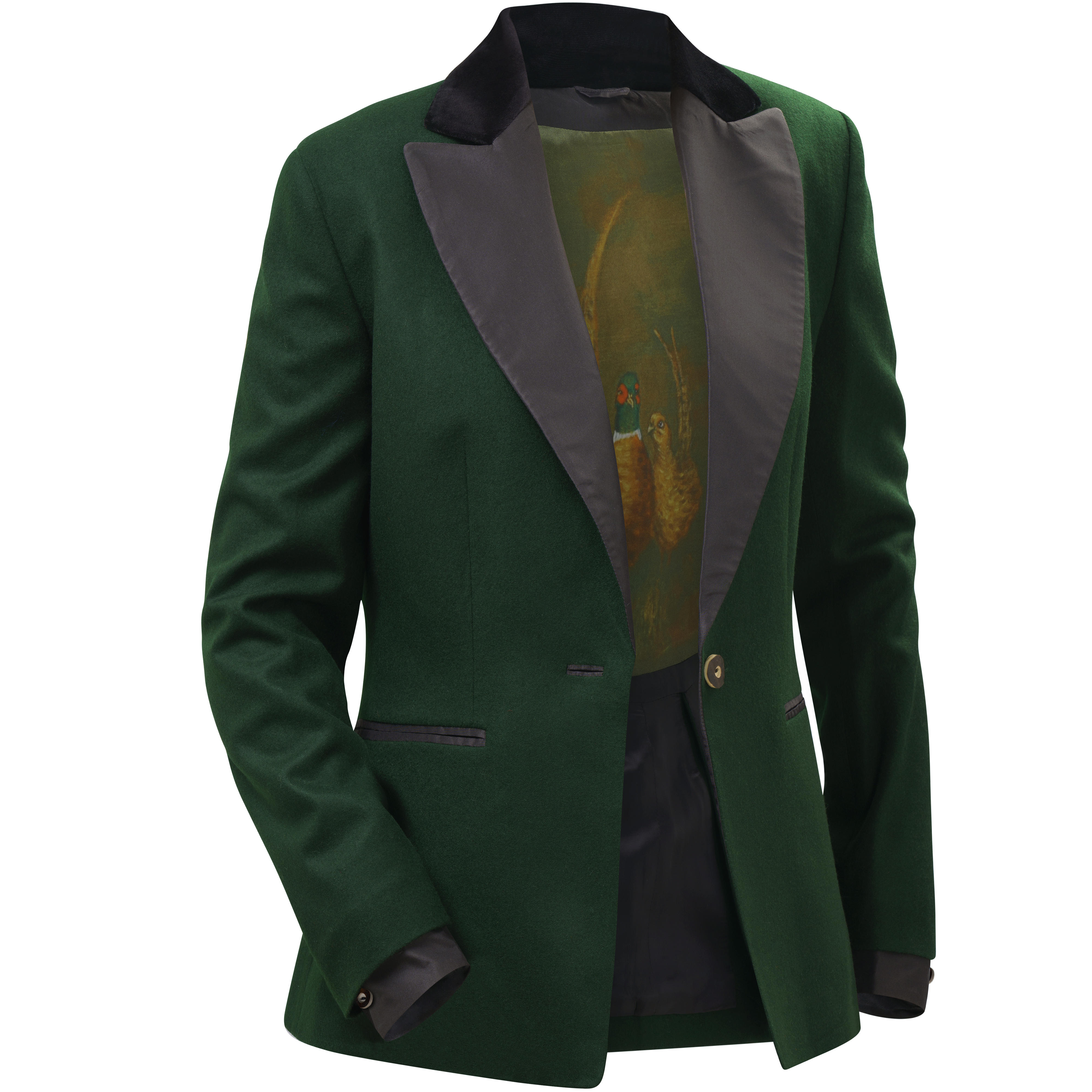 Hervorstechende Details wie der tiefe Reverskragen aus reiner Seide, die beiden Seitenschlitze im Rückenteil, handgefertigte Knopflöcher und der markante Hirschhornknopf verleihen dem Blazer jagdliche Noblesse und Charakter. Das handgemalte Innenfutter von Brigitte Stajan unterstreicht gekonnt die subtile Eleganz und macht den Blazer zu einem absoluten Highlight.