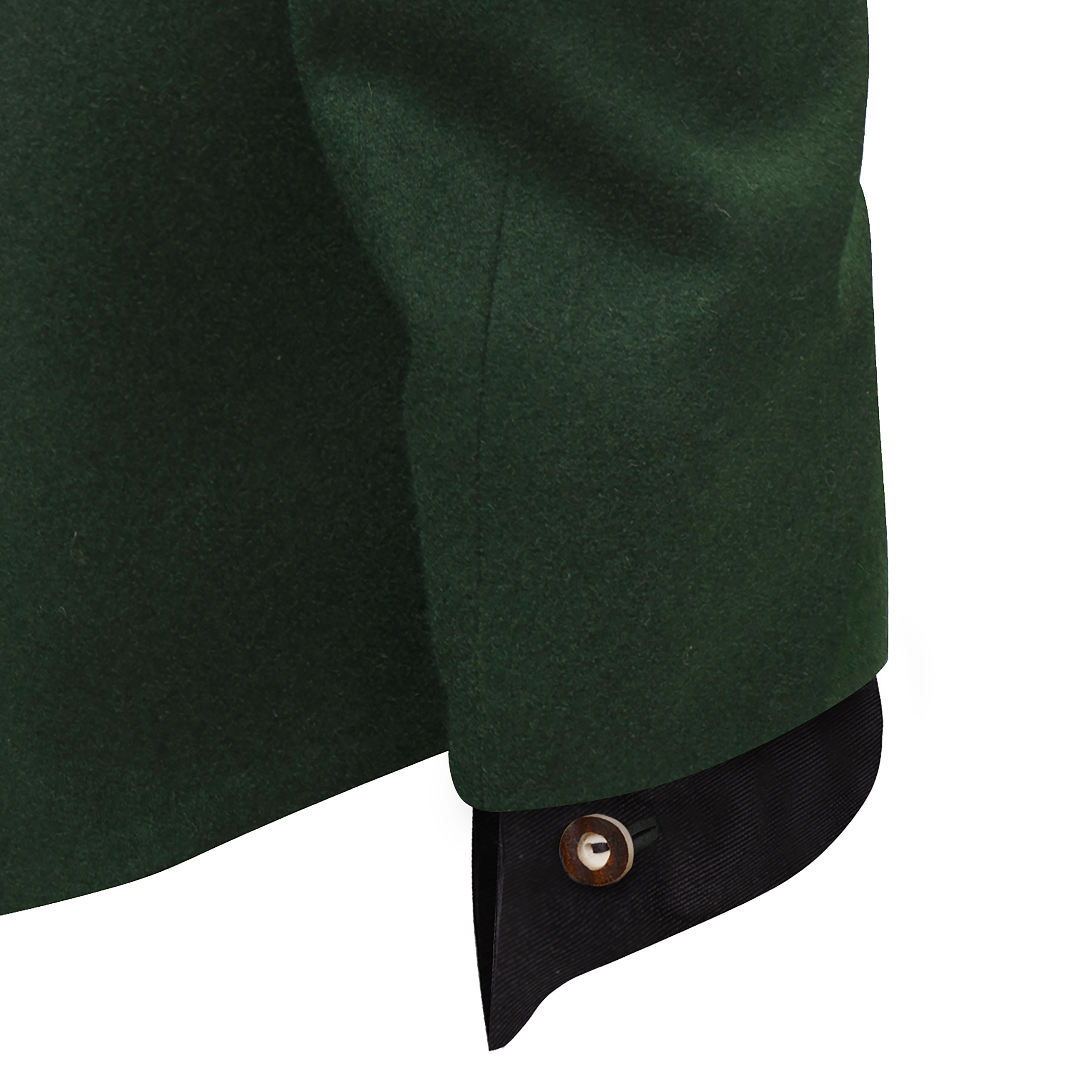 | Material: | Oberstoff: 100 % Schurwolle; Besätze: 100 % Seide; Futter: 100 % Viskose; Knöpfe: Hirschhorn |