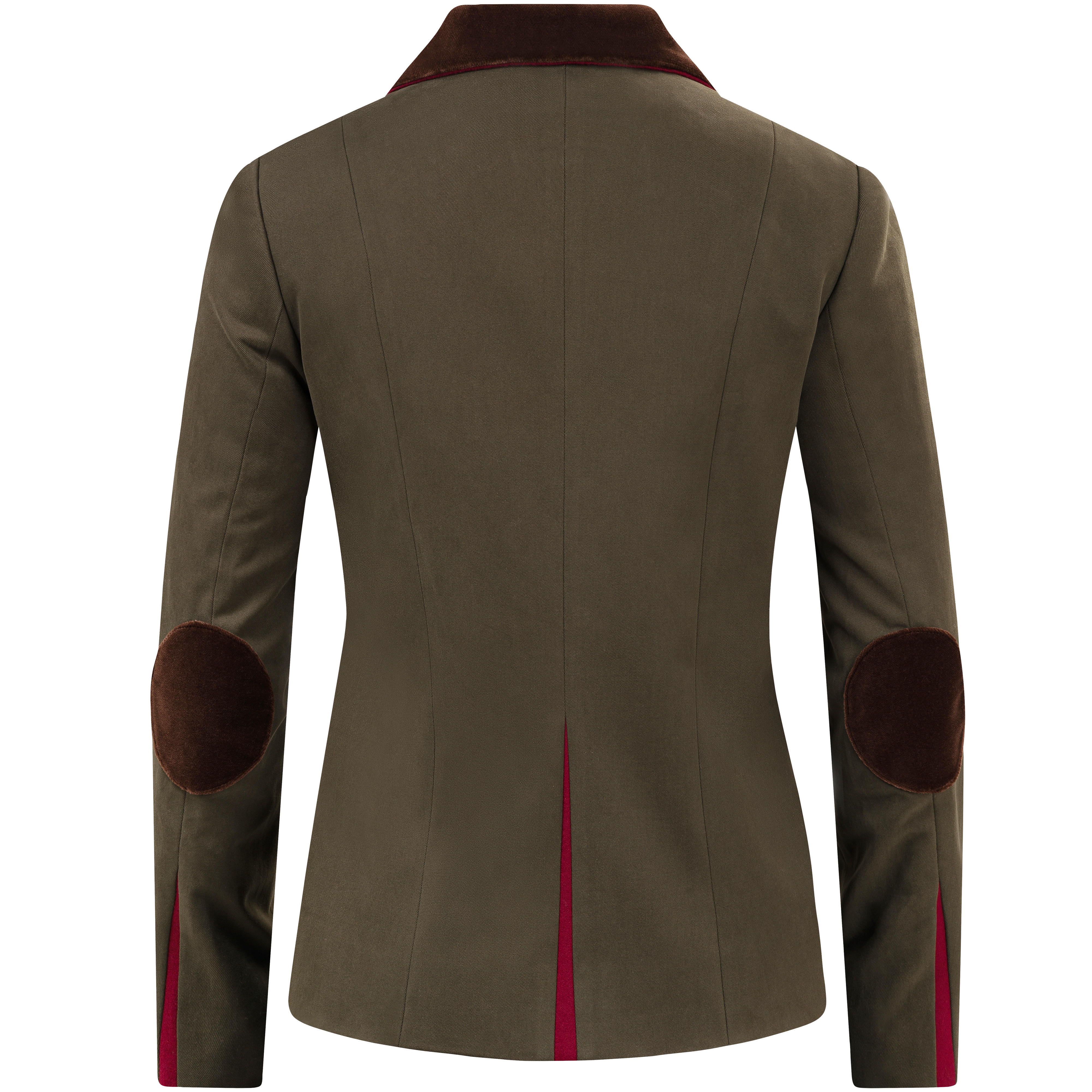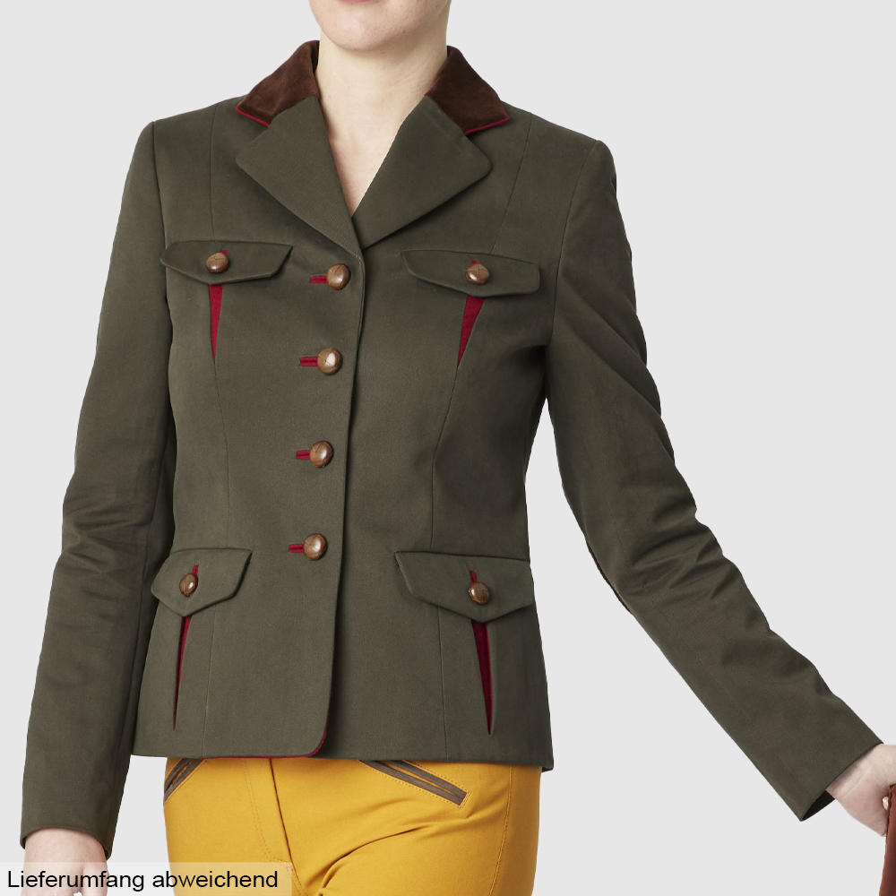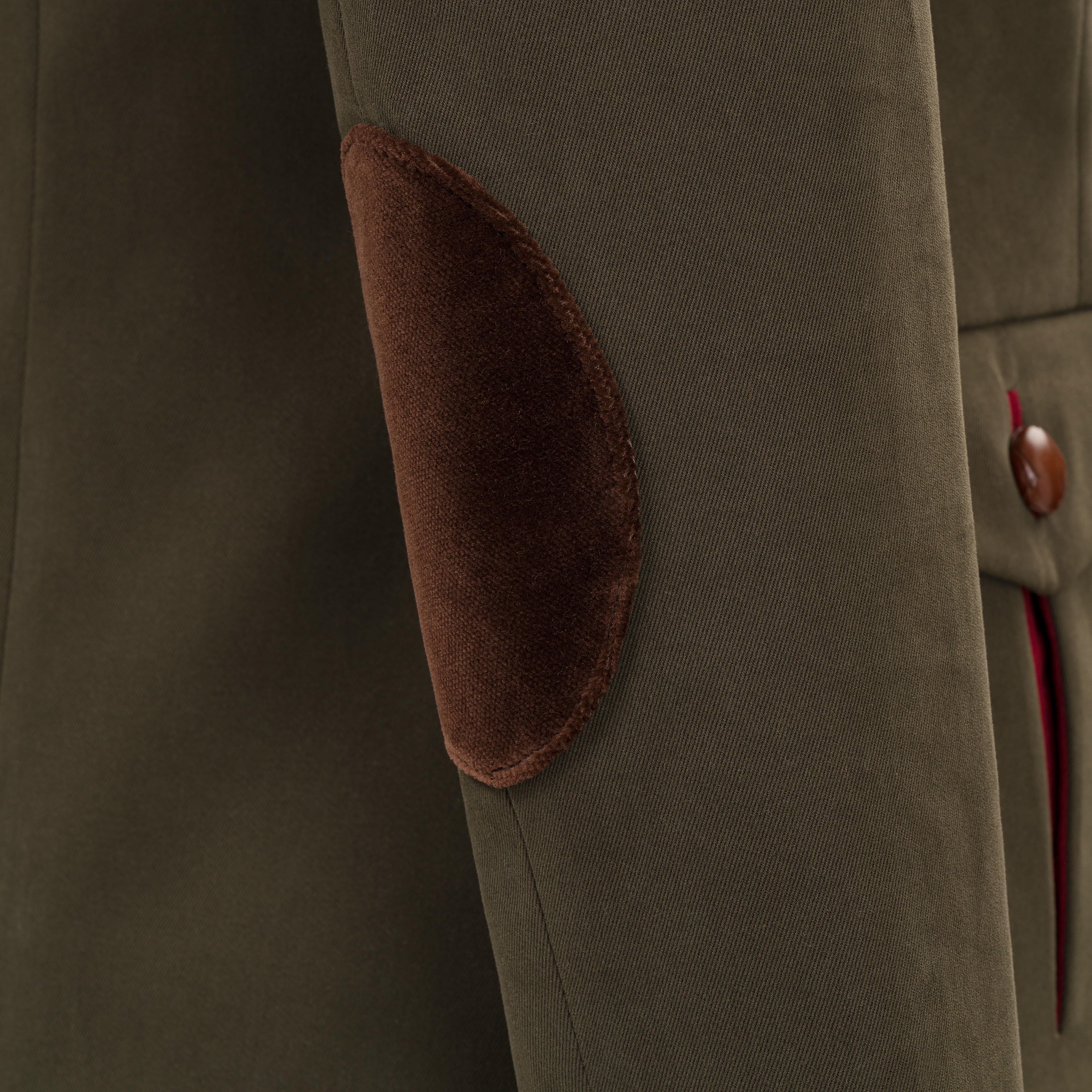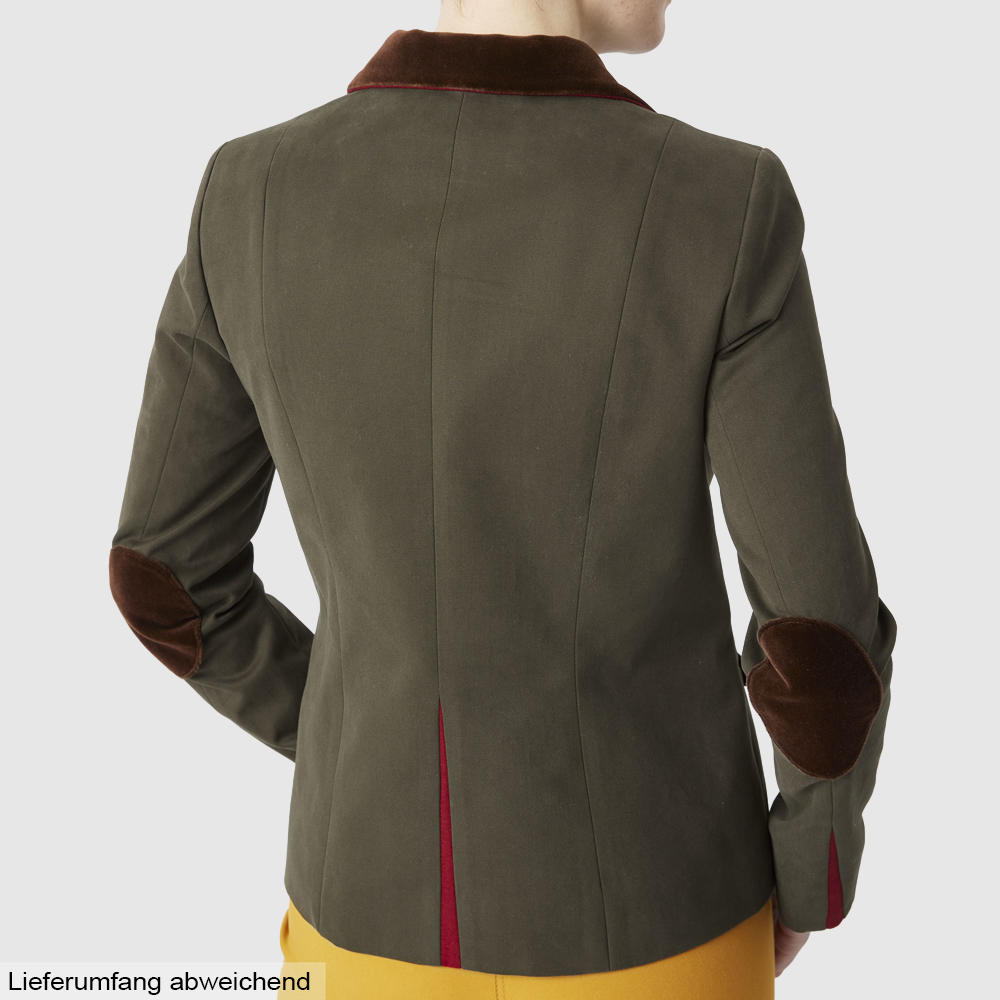 Fein akzentuierte Besätze aus hochwertigem Samt am Kragen und an den Ellenbogen, zusammen mit vier sorgfältig verarbeiteten Taschen auf der Vorderseite, unterstreichen das sportlich-elegante Erscheinungsbild des Blazers. Ergänzt wird das Design durch stilvolle Lederflechtknöpfe und kontrastierende Canvas-Einsätze an den Manschetten sowie einem angedeuteten Rückenschlitz, die den markanten und zugleich femininen Look gekonnt abrunden.