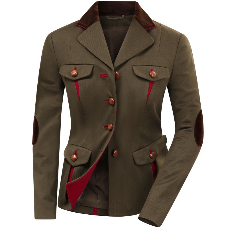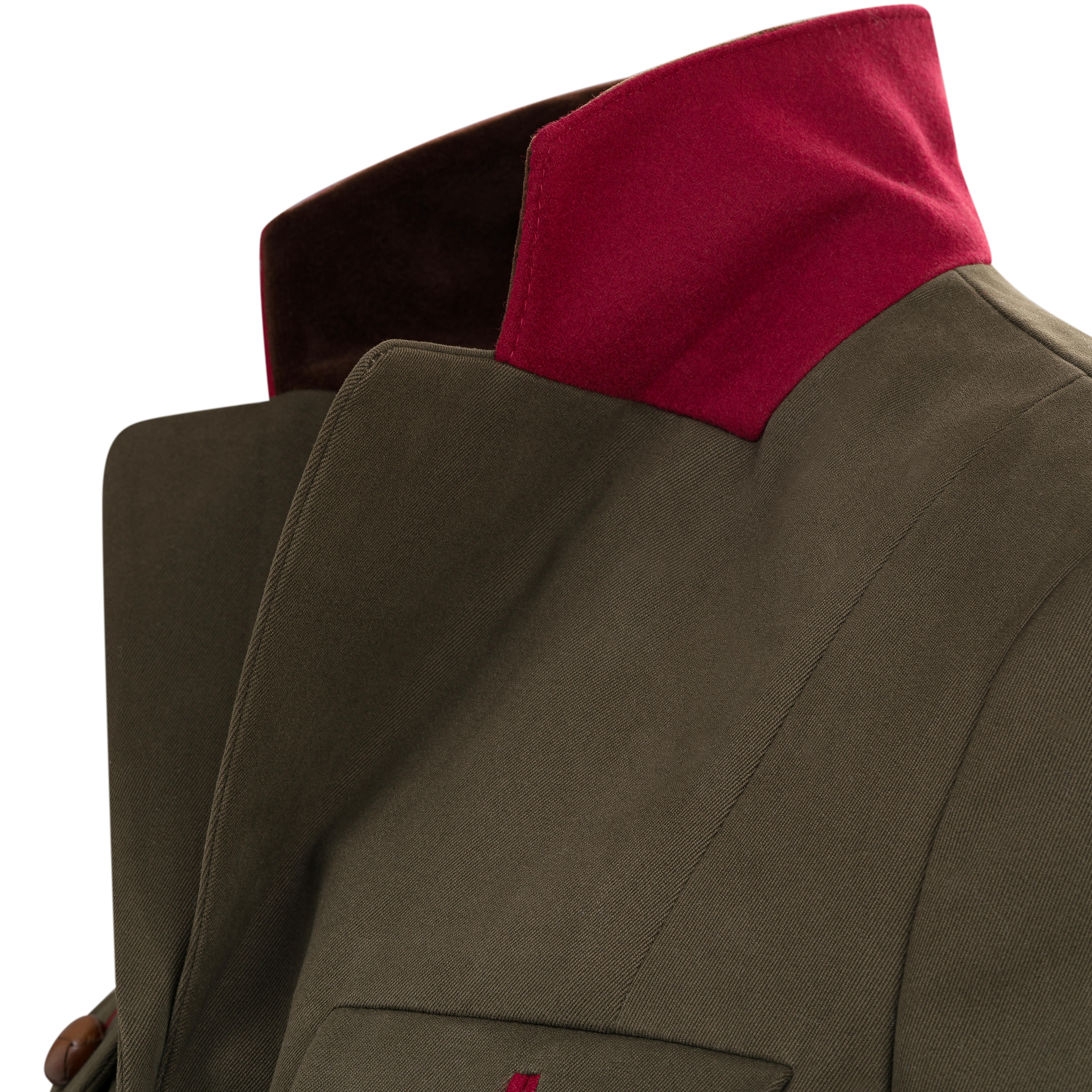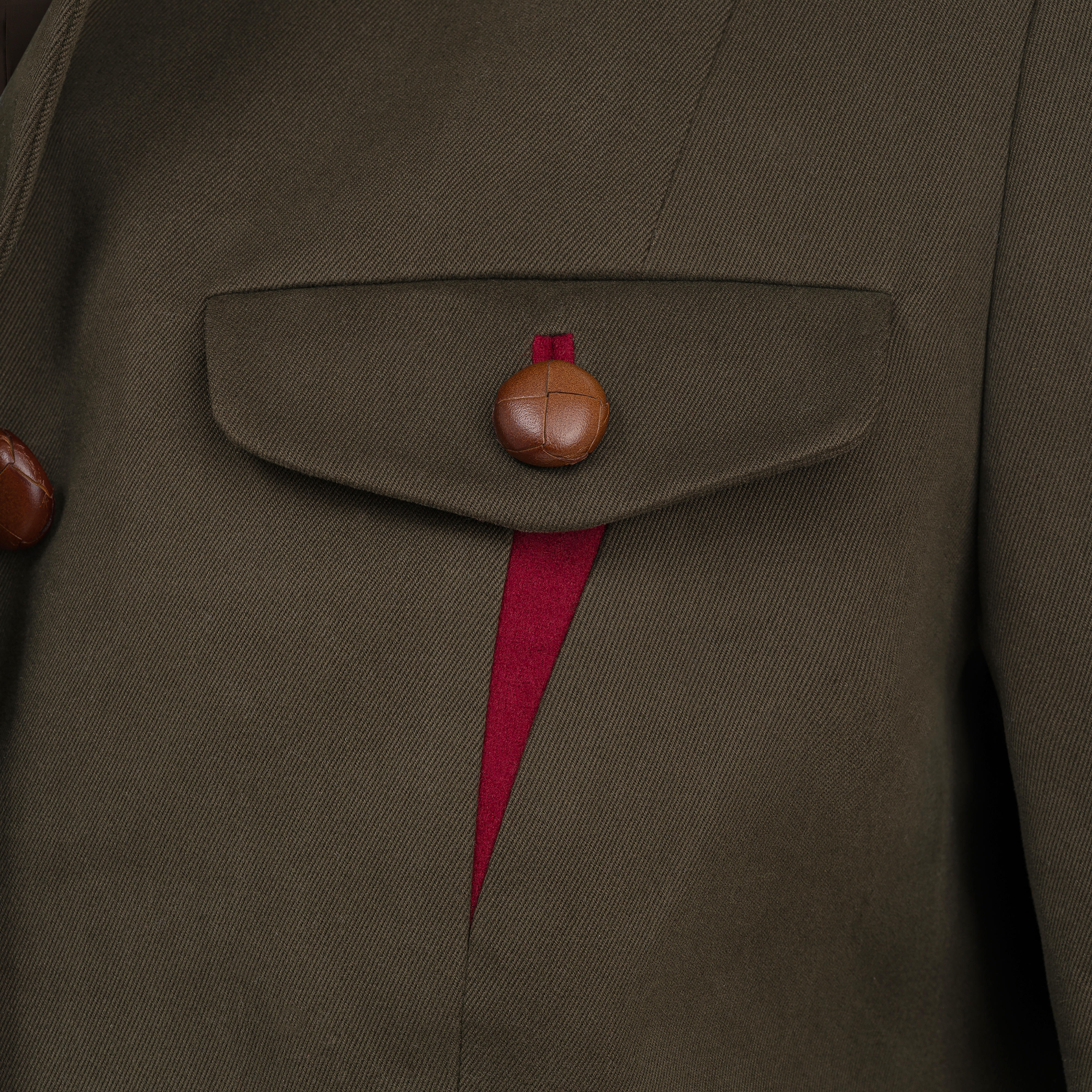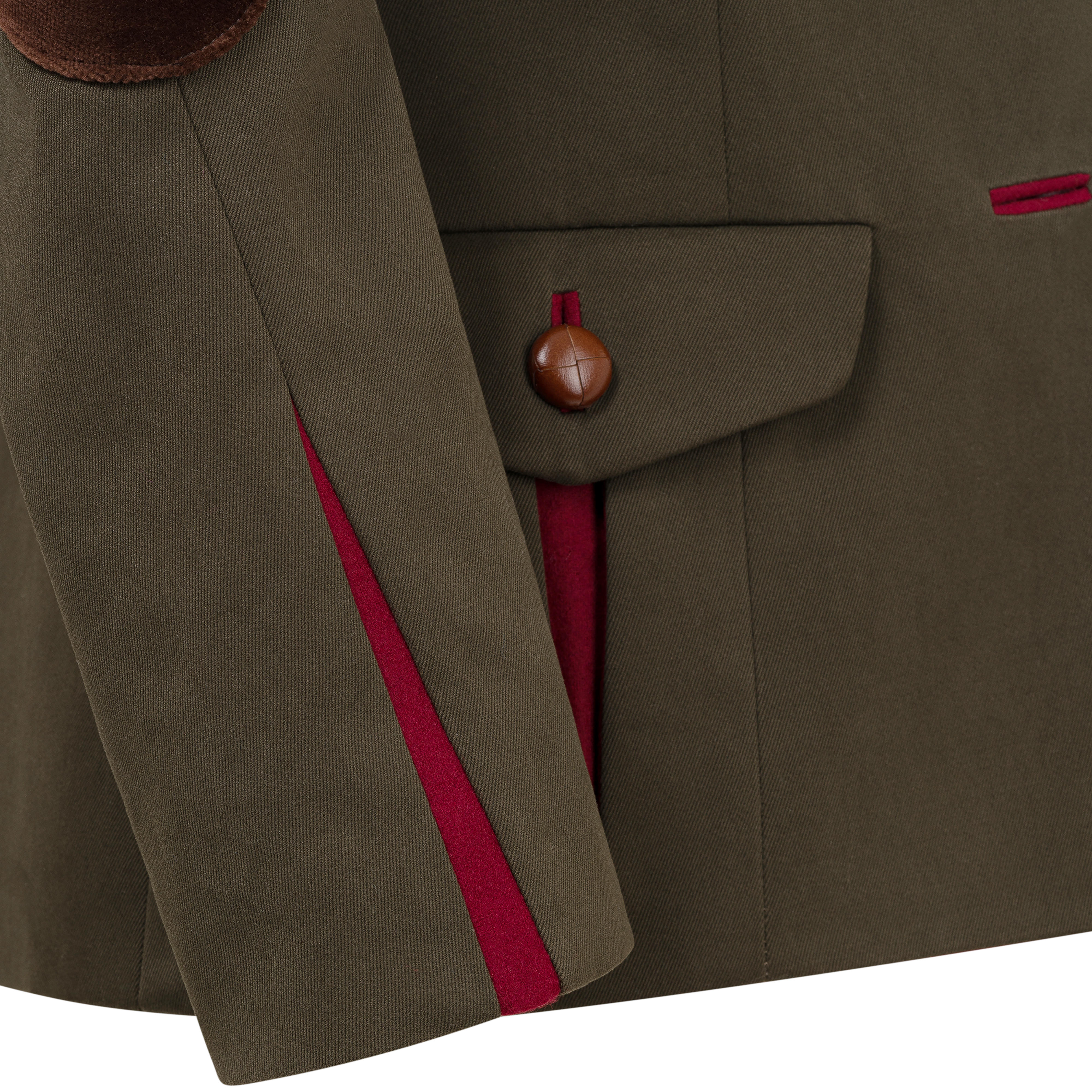 Fein akzentuierte Besätze aus hochwertigem Samt am Kragen und an den Ellenbogen, zusammen mit vier sorgfältig verarbeiteten Taschen auf der Vorderseite, unterstreichen das sportlich-elegante Erscheinungsbild des Blazers. Ergänzt wird das Design durch stilvolle Lederflechtknöpfe und kontrastierende Canvas-Einsätze an den Manschetten sowie einem angedeuteten Rückenschlitz, die den markanten und zugleich femininen Look gekonnt abrunden.
