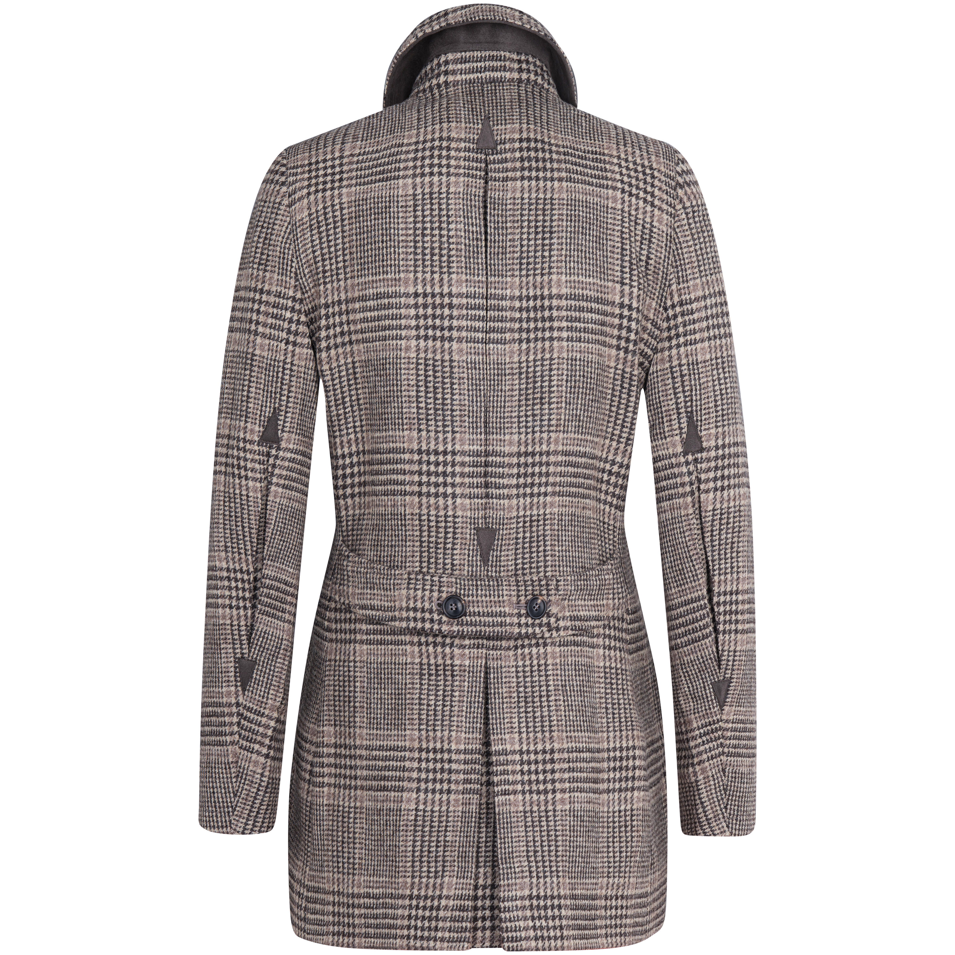 Die körpernahe, leicht taillierte Schnittführung unterstreicht die feminine Silhouette. Fein gearbeitete Schlitze an Ärmeln und Rücken sorgen für ein angenehmes Tragegefühl, selbst bei längeren Spaziergängen oder im Einsatz bei der Jagd. Der taupefarbene Kragenfilz, ein dezenter Blickfang, verleiht dem Erscheinungsbild zusätzliche Raffinesse.