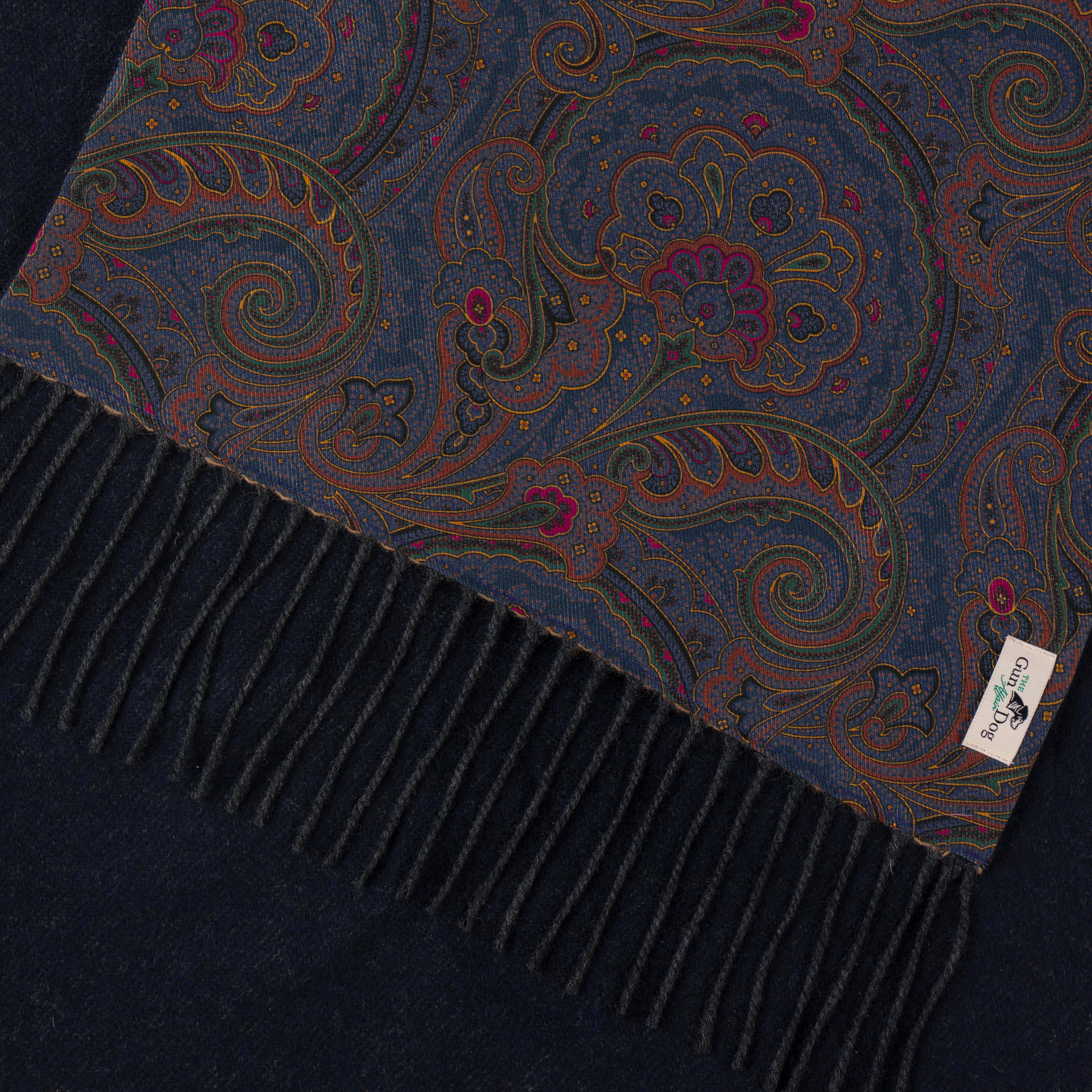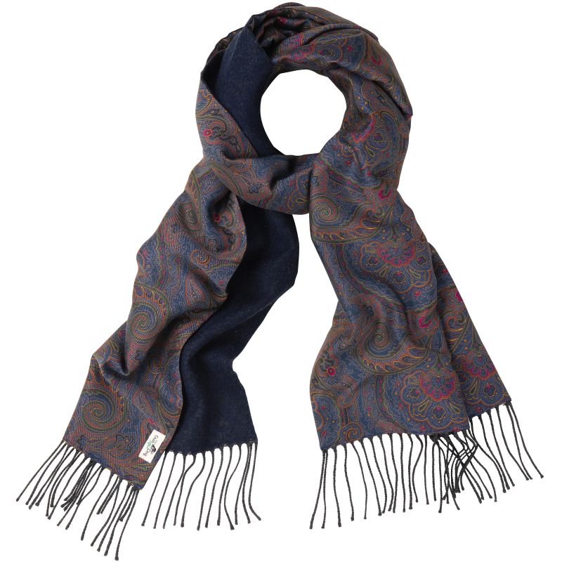 Klassisch als Doubleface-Schal gearbeitet, zeigt sich auf der einen Seite ein opalisierendes Paisley-Muster auf edel schimmernder Seide, während die Rückseite aus feinster Kaschmirwolle für angenehme Wärme und luxuriösen Tragekomfort sorgt.