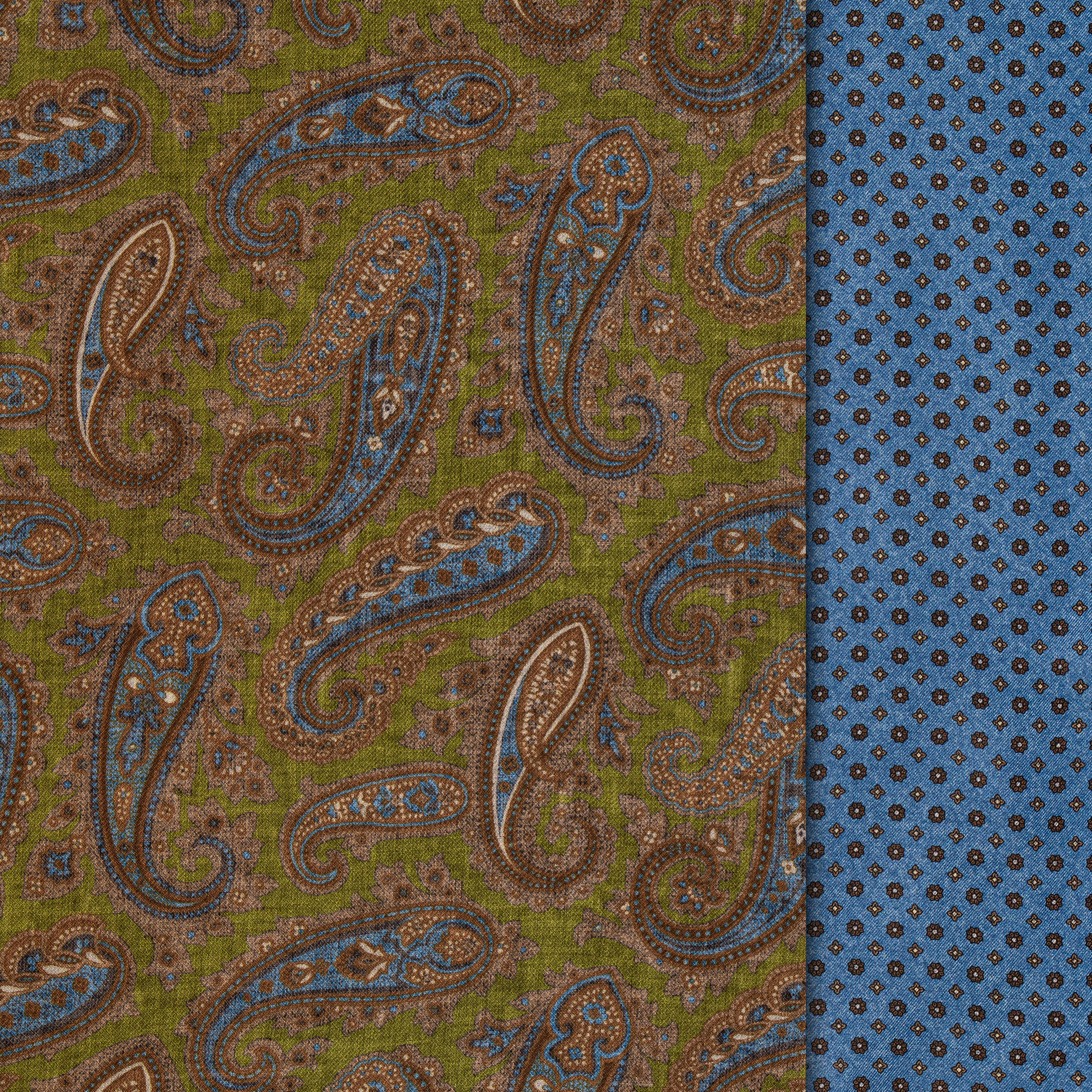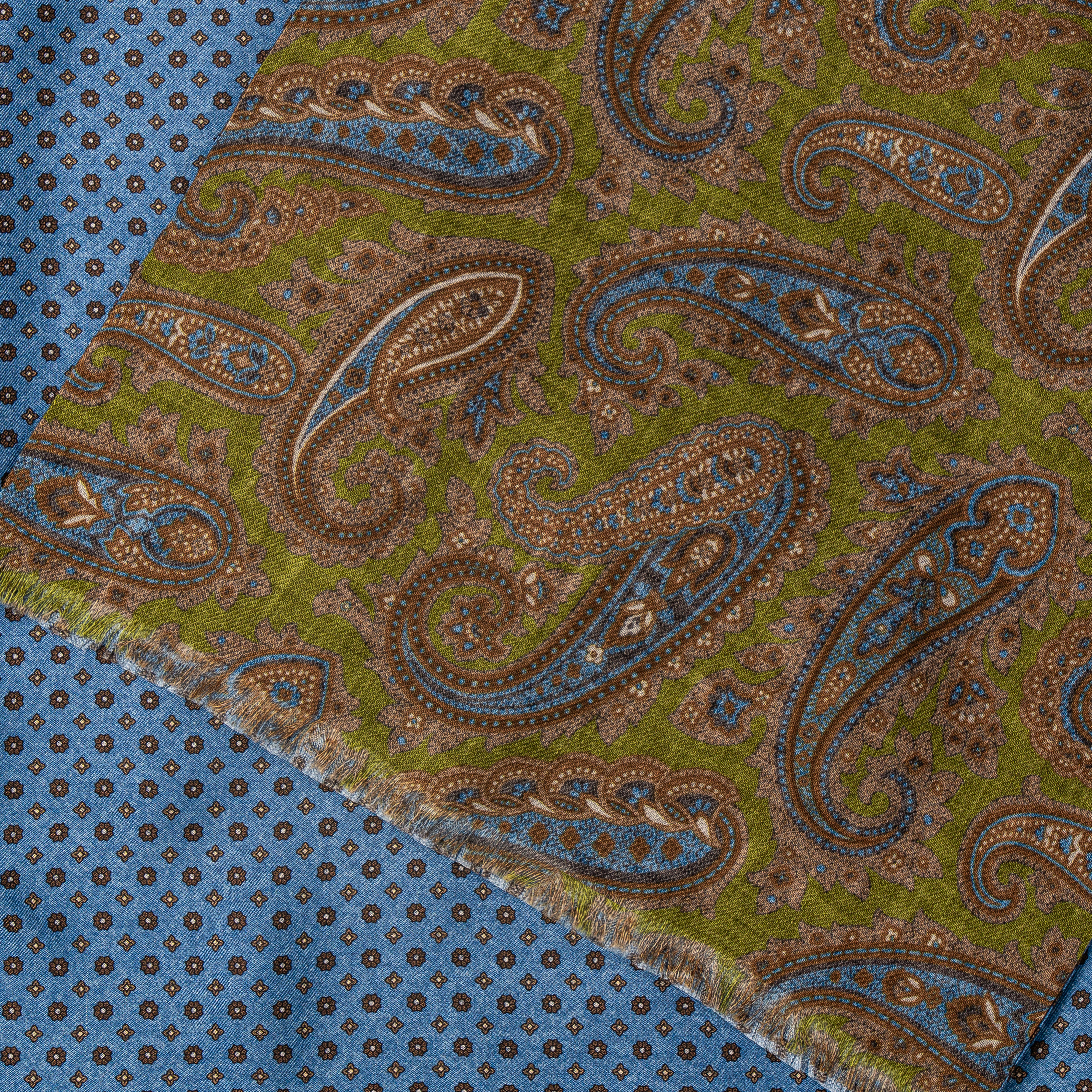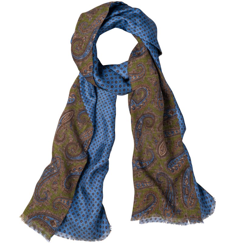 Auf der einen Seite präsentiert sich ein opalisierendes Paisley-Muster auf fein schimmernder Seide, während die Rückseite aus farblich harmonierender, weicher Wolle gefertigt ist. Dieses Zusammenspiel aus Seide und Wolle sorgt nicht nur für eine angenehme Haptik, sondern auch für ein stilvolles Erscheinungsbild – ob bei gesellschaftlichen Anlässen oder im täglichen Einsatz.